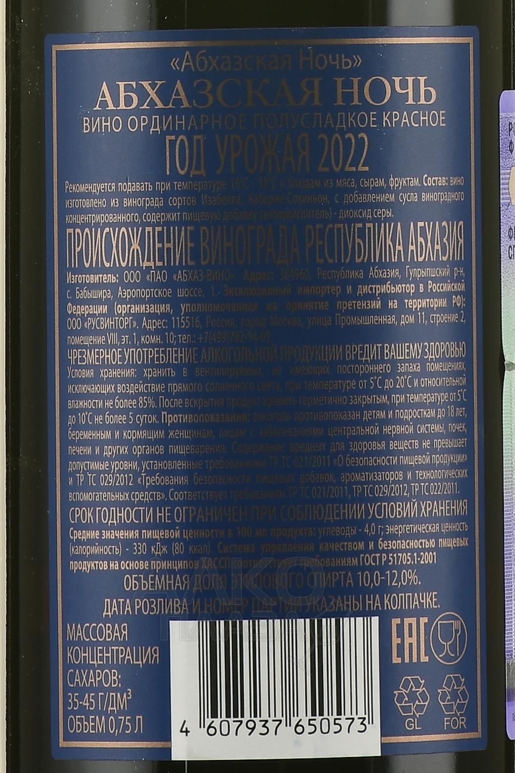 Красное полусладкое вино Абхазская Ночь 0,75 л объединяет в составе отборный абхазский виноград, собранный в спелом виде на угодьях предприятия Абхаз Вино. Изготовление на передовом оборудовании включало сбраживание, которое остановили принудительно, когда 12-градусный напиток приобрел сахаристость в пределах 35-45 г/л. Также его подвергли фильтрации. Перед отправкой спиртного на продажу был проведен контроль качества.