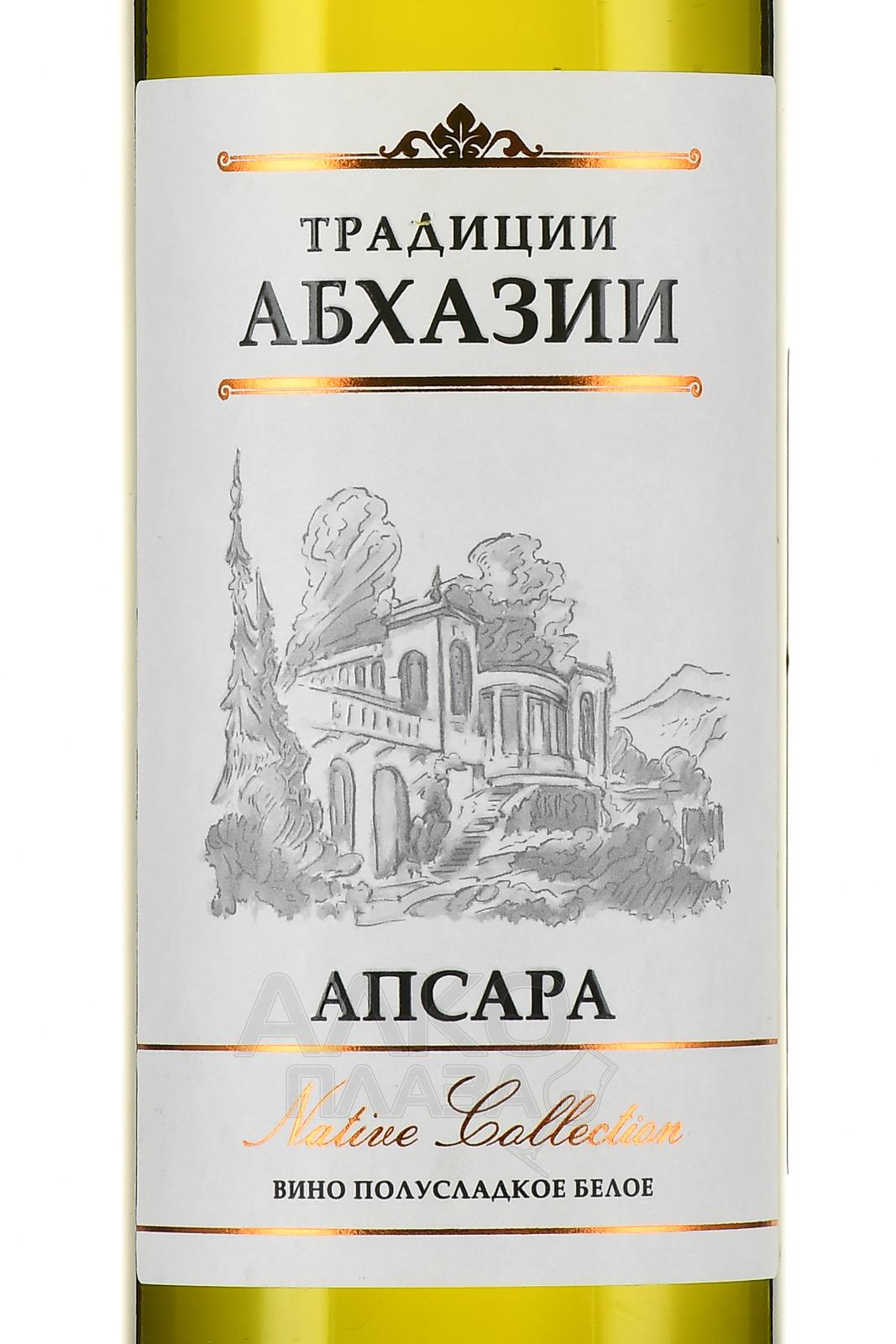 Белое полусладкое вино Апсара ТМ Традиции Абхазии 2020 г. было произведено в Абхазии, Гагрском районе, из европейских сортов винограда с местных угодий. Для сохранения необходимой сахаристости (35-45 г/л) сырье сбраживалось при определенной температуре, после чего процесс остановили искусственно. Крепость винтажного вина варьируется от 10 до 12 градусов.
