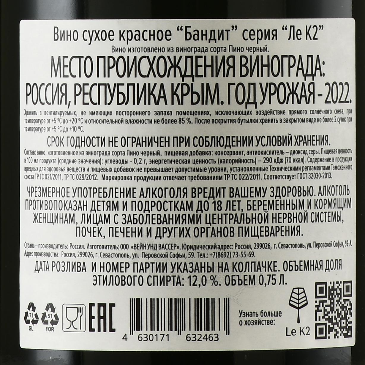 Красное сухое вино Бандит серия Ле К2 2022 года 0,75 л было выпущено ограниченным тиражом (около 1000 бутылок). Оно многогранное и интригующее. На этикетке не зря изображена маска, ведь букет напитка многослойный. Сначала он кажется одним, потом, по выражению производителя, «бандит снимает маску», и все меняется. В роли сырья выступил сорт Пино Нуар с севастопольских виноградников. Винификация включала в себя карбоническую ферментацию целых гроздей и последующую малолактику. Вино было выдержано 6 месяцев в 500-литровых французских бочках.