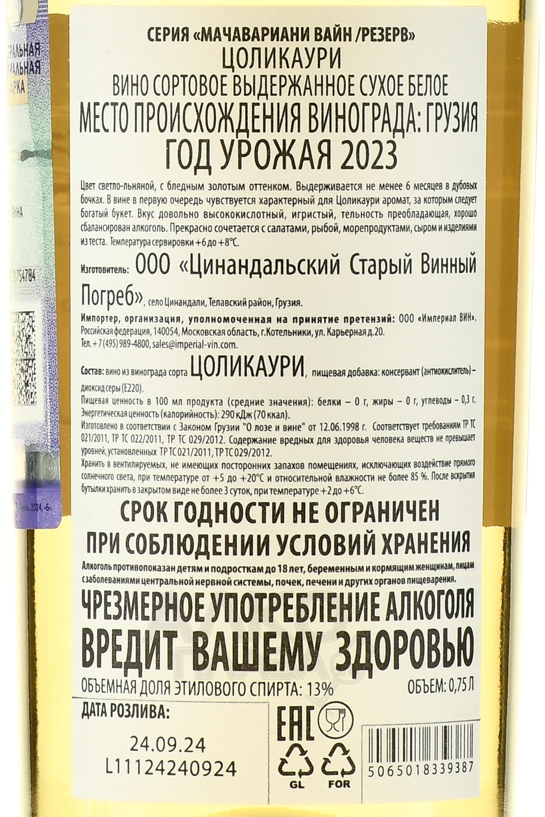 Белое сухое вино Tsolikauri Machavariani Wine Reserve 2023 г. 0,75 л – авторская моносортовая вариация, созданная из автохтонного грузинского сорта ягод. Урожай 2023 года отличился продолжительным теплым летом и стабильными осадками, что способствовало гармоничному созреванию винограда с выраженной кислотностью и концентрированным ароматом. Плоды собрали вручную в оптимальной фазе зрелости, тщательно отбирая только здоровые и спелые грозди. Ферментация проходила при постоянной низкой температуре, а после окончания брожения напиток созревал не менее полугода в дубовых бочках, где приобрел выраженную структуру и элегантность.