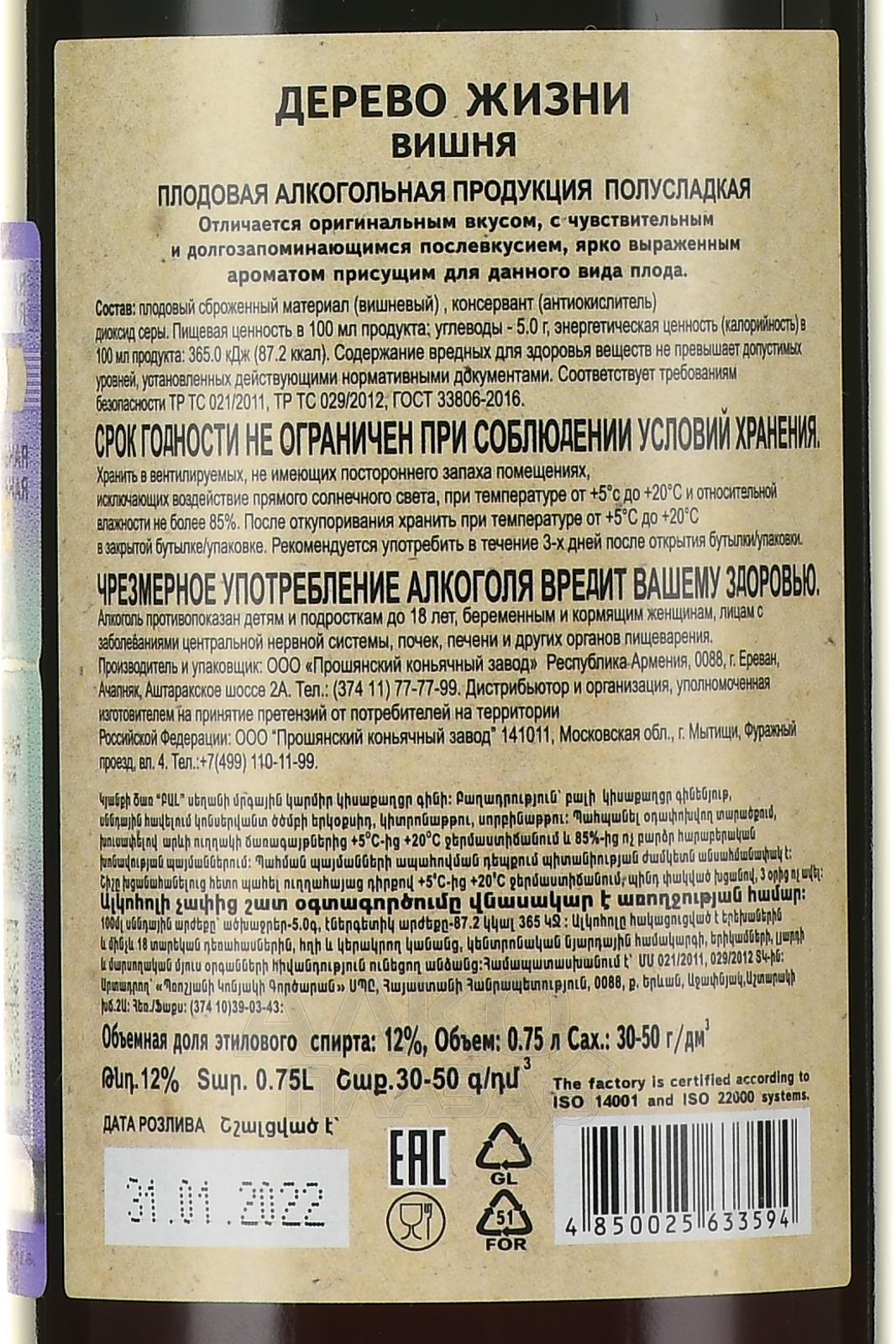 Алкогольный напиток Дерево жизни Вишня 0,75 л обладает умеренным содержанием спирта и приятным букетом. Это полусладкое плодовое вино сделано из вишневого сусла. Сырье для производства Tree Of Life Cherry собрали в жарком армянском климате, в котором ягоды созрели с великолепным ароматом и повышенным содержанием природных сахаров.