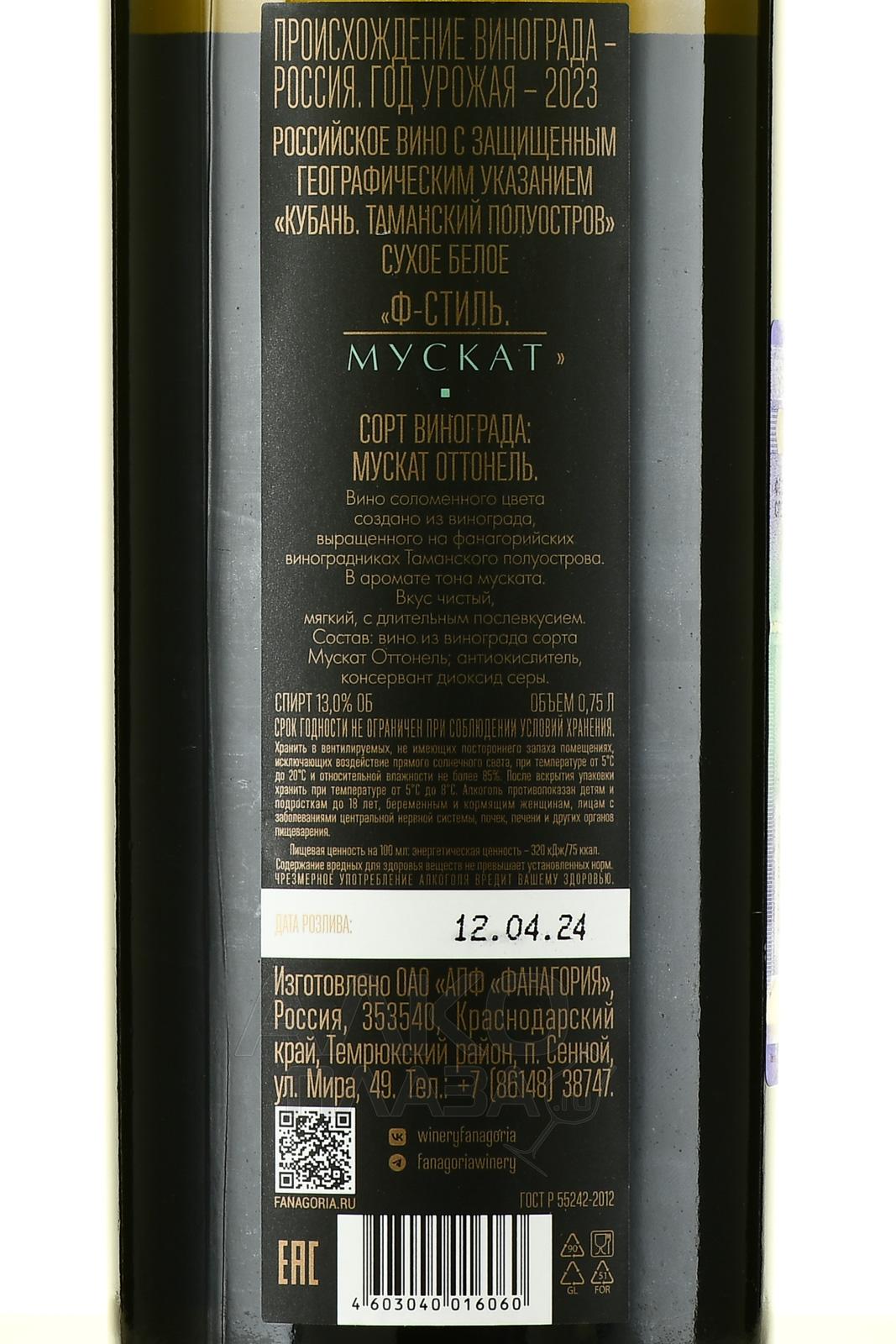 Белое сухое вино Ф-Стиль Мускат Фанагория ЗГУ «Кубань. Таманский полуостров» 2023 года 0,75 л изготовлено из одного сорта винограда, который выращивается в уникальном таманском терруаре. Он находится в зоне древнего разлома тектонических плит, где в античную эпоху было устье реки. Сбор урожая производилось на пике зрелости. Для получения сусла применялся пневматический пресс. Ферментация протекала при 15 градусах, процесс брожения останавливали путем сильного охлаждения. Вино недолго выдерживалось для стабилизации и бутилировалось после деликатной фильтрации.