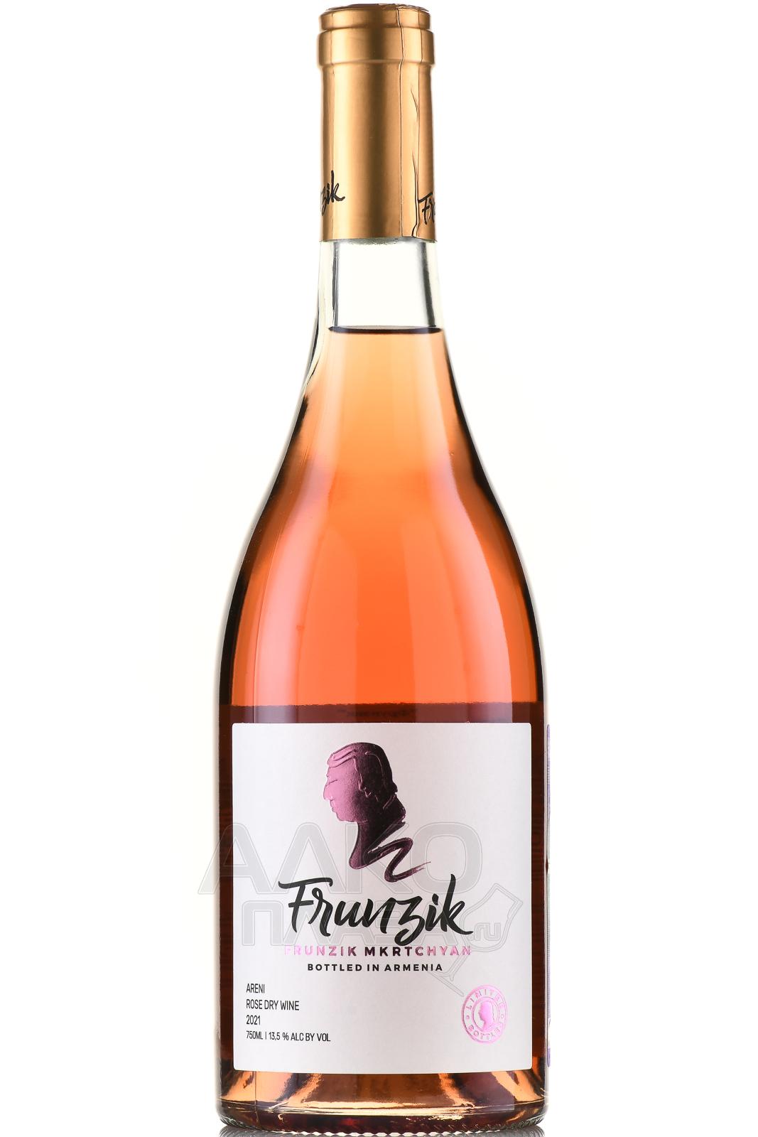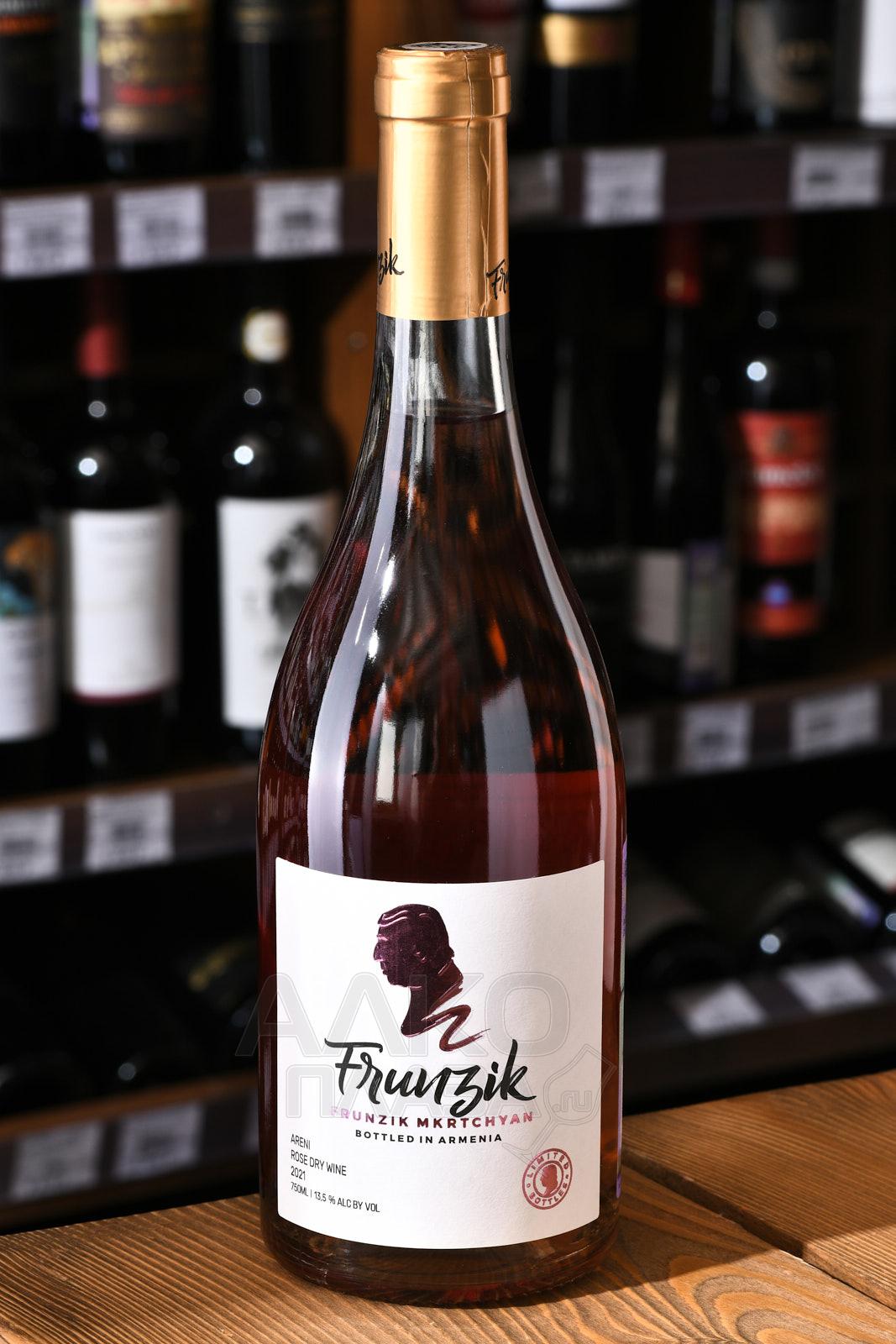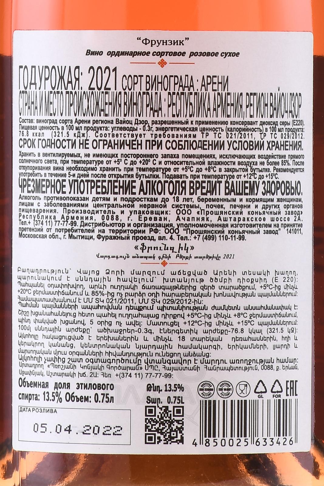 Розовое сухое вино Фрунзик 0,75 л — это моносортовой армянский алкоголь среднего уровня крепости (13,5 процента), выпущенный Прошянским Коньячным Заводом в линейке молодых видов спиртного. Производство осуществилось с соблюдением современных требований качества путем обработки автохтона Арени: его подвергли недолгой процедуре мацерации на кожице, чтобы сделать оттенок напитка розоватым, а вкус — насыщенно-ягодным. Также сусло прошло процесс ферментации в стальных баках с регулировкой температурного режима. Недорогое вино не выдерживалось в дубе, а значит, предпочтительно пить его сразу после покупки или в течение одного-двух лет.