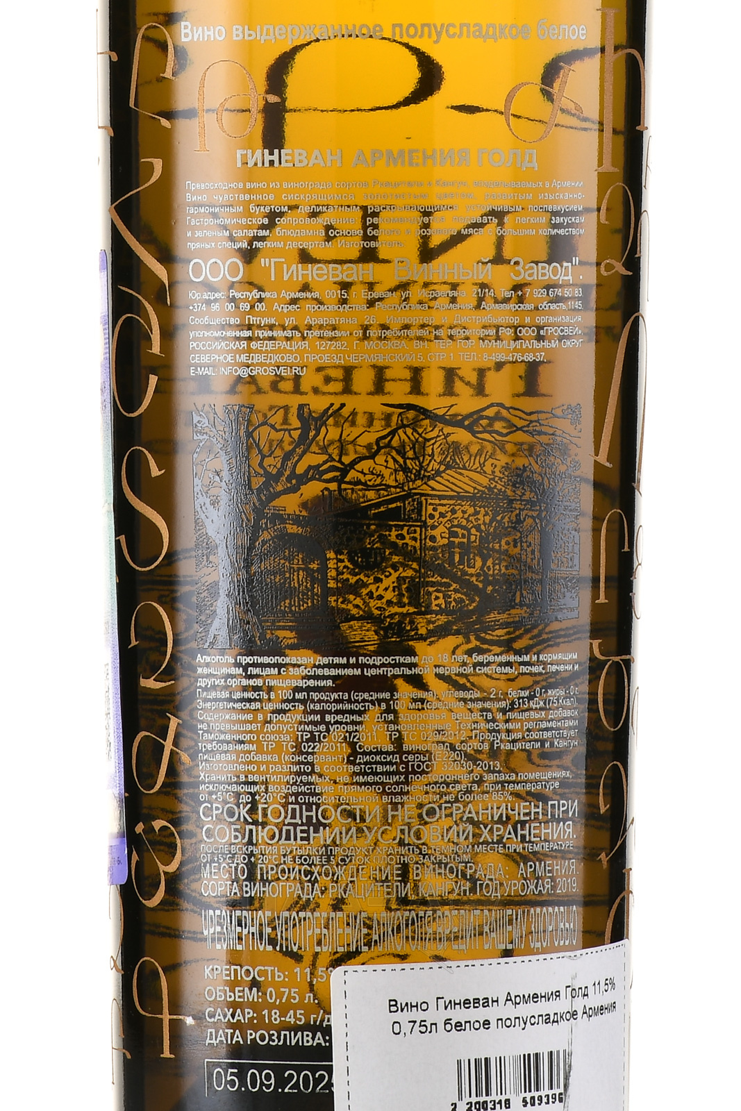 Вино Гиневан Армения Голд 0.75 л белое полусладкое