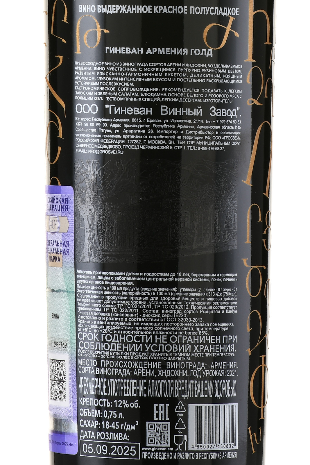 Вино Гиневан Армения Голд 0.75 л красное полусладкое
