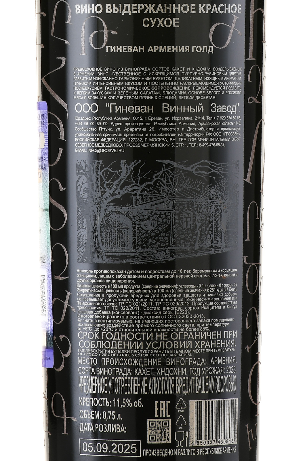 Вино Гиневан Армения Голд 0.75 л красное сухое