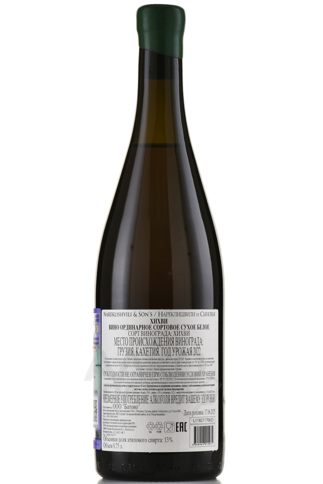 Вино белое сухое Khikhvi Nareklishvili and Son`s 2021 г. 0,75 л – это яркое выражение богатой истории грузинского виноделия и щедрого кавказского терруара. Напиток создан из органического сырья с минимальным вмешательством человека в процесс. Винодел в третьем поколении Иван Нареклишвили использовал для получения спиртного технологию квеври, при которой сусло ферментируется на природных дрожжах в больших кувшинах из глины. Вкопанные в землю до самой горловины емкости позволяют естественным образом поддерживать оптимальную для брожения температуру, а наличие мезги обеспечивает формирование выразительной танинной структуры, типичной для красных вин.
