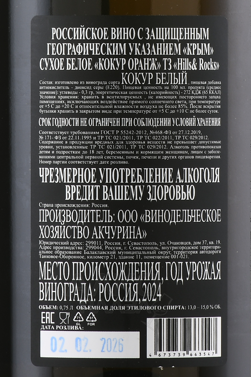 Вино Хилс энд Рокс Кокур Оранж 0.75 л белое сухое