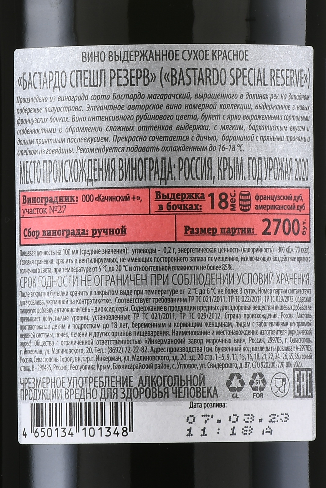 Вино Инкерман Спешл Резерв Бастардо 0.75 л красное сухое