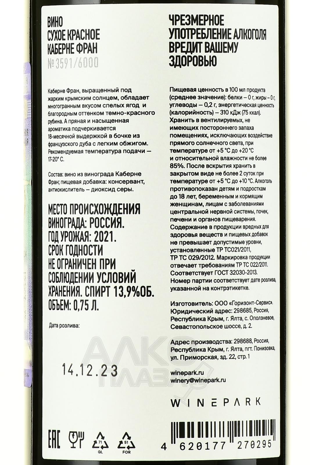 Красное сухое вино Каберне Фран №3591/6000 2022 год 0,75 л представлено в рамках линейки лимитированного алкоголя, каждая бутылка которого имеет индивидуальный номер. Вариацию произвели в Крыму из стопроцентного винограда европейской группы сортов, выращенного в солнечном жарком климате. Вино ферментировали классическим способом (в нейтральных баках с регулировкой температурного диапазона) и выдерживали в дубовой таре слабого обжига на протяжении восемнадцати месяцев.