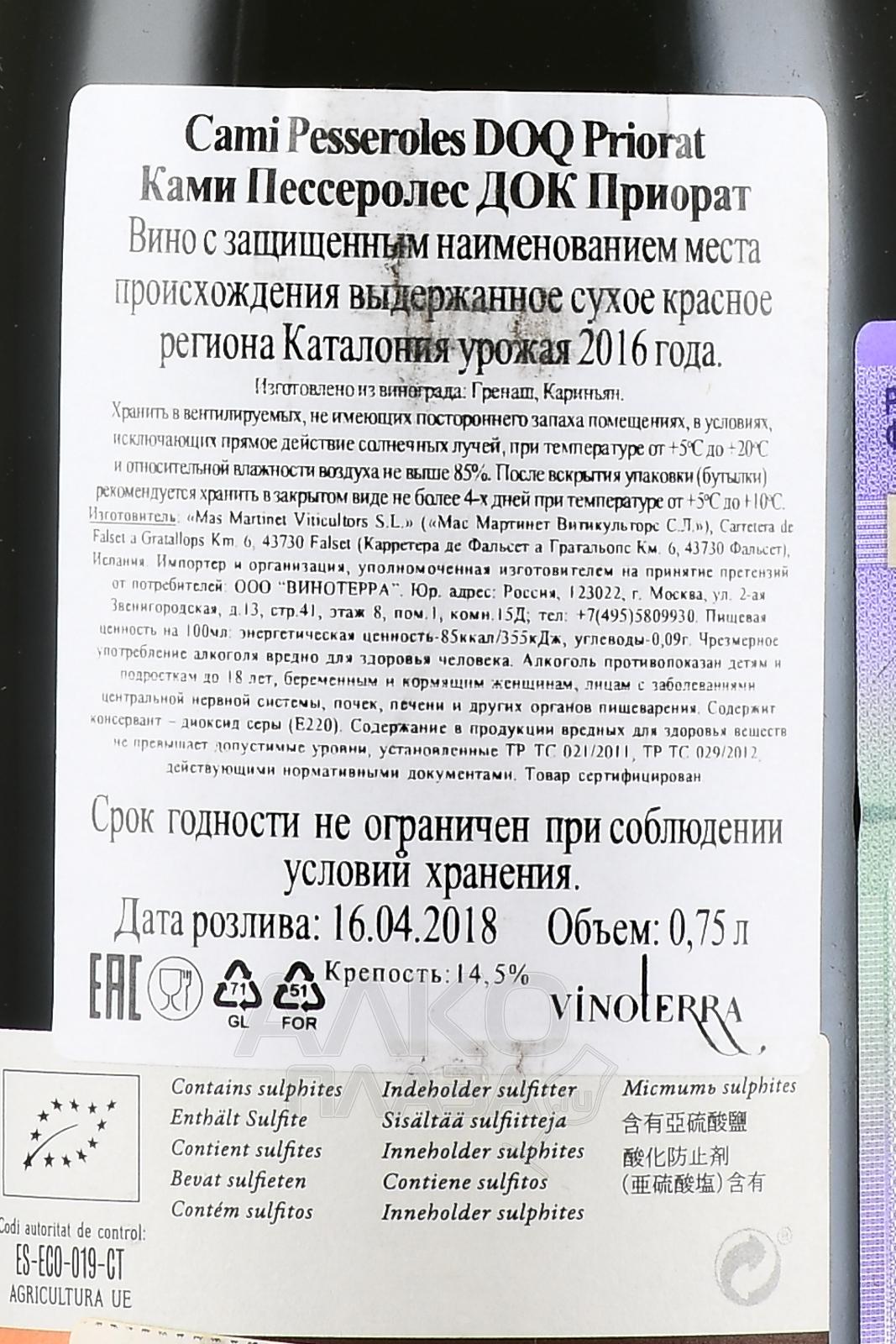 Mas Martinet Cami Pesseroles Priorat DOQ - вино Мас Мартинет Ками Пессеролес 0.75 л красное сухое
