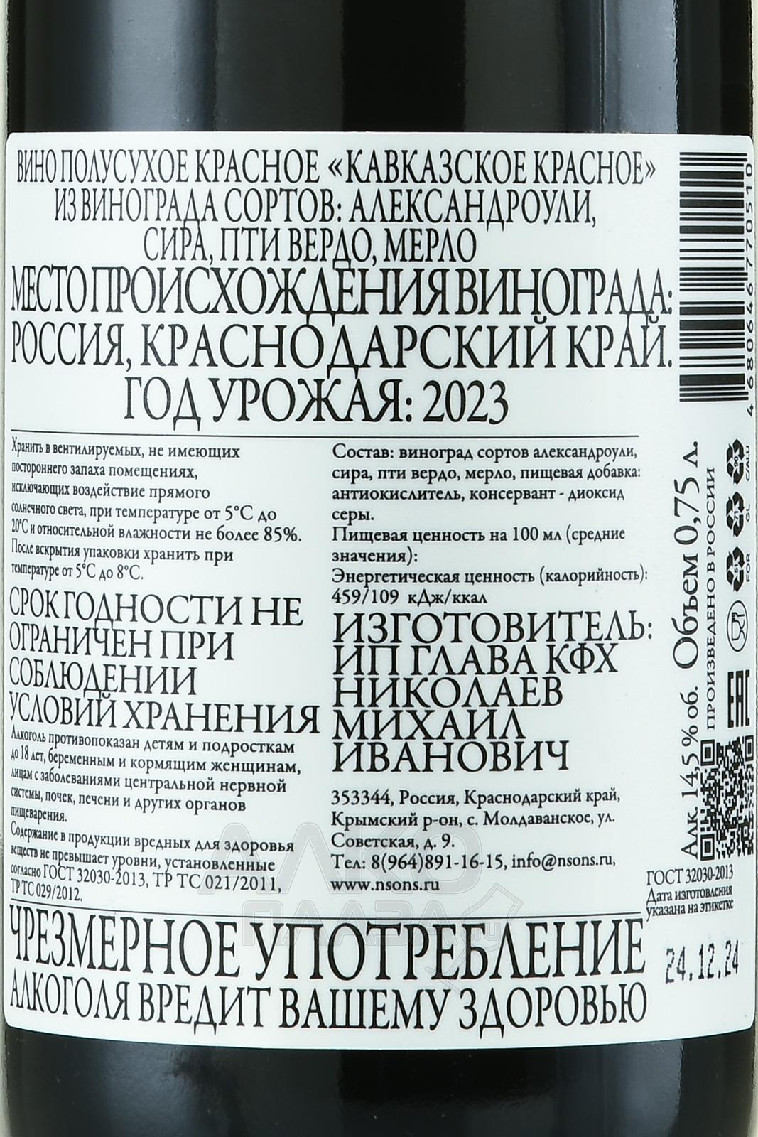 Красное полусухое вино Николаев и Сыновья Кавказское красное 0,75 л производится в рамках защищенного географического наименования «Кубань. Крымск». Купаж представлен смесью четырех сортов винограда – почти половину бленда составляют ягоды редкого кавказского автохтона, остальная часть – это плоды распространенных французских разновидностей. Урожаи, созревшие на тяжелых глинистых и красных илисто-песчаных, с высокой концентрацией железистых соединений почвах, собрали вручную. На винодельне их сортировали и ферментировали по классической технологии – сусло сбраживалось вместе с мезгой в стальных резервуарах. Когда уровень сахара достиг нужного значения 23 г/л, брожение остановили путем сильного охлаждения. Затем 55% ассамбляжа было выдержано на протяжении 10 месяцев в бочках из венгерского и французского дуба.