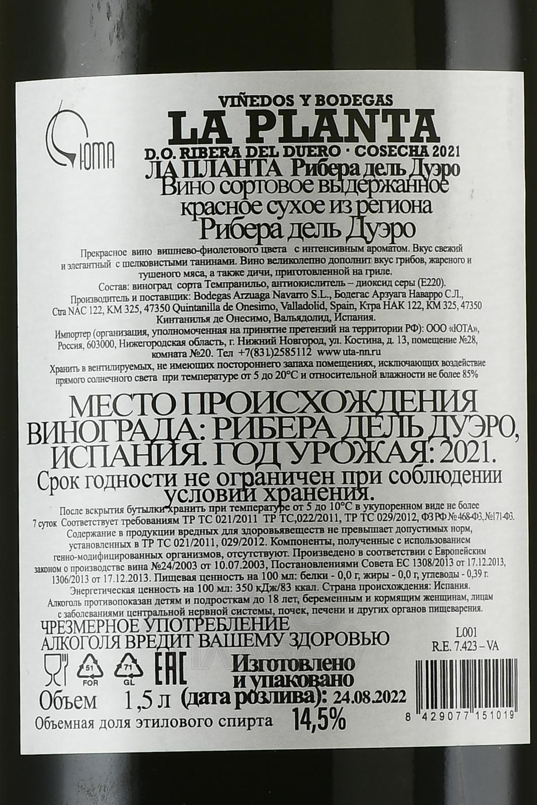 Красное сухое вино La Planta 1,5 л производится из автохтонного испанского винограда, урожаи которого собирают в крупном винодельческом центре страны – регионе Рибера-дель-Дуэро. Высота 900 метров над уровнем моря, жаркий климат и глинисто-известняковые почвы придают местным напиткам особый стиль. Ягоды собирают на собственных плантациях компании прохладным ранним утром. В погребе в течение трех дней плоды вымачиваются вместе со шкурками, а после проводится алкогольная ферментация при 22 °С на протяжении недели. Перед бутилированием напиток созревает полгода в бочках из французского и американского дуба.