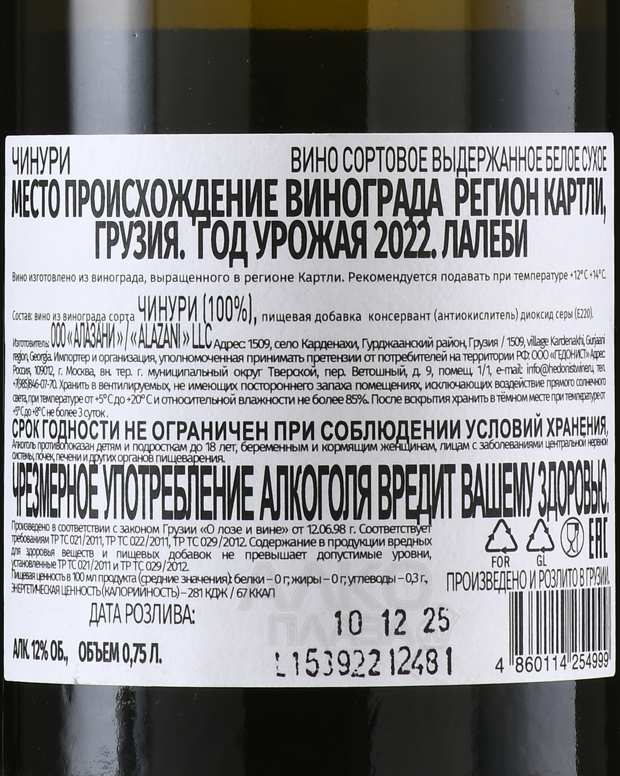 Вино Лалеби Чинури Квеври 0.75 л белое сухое