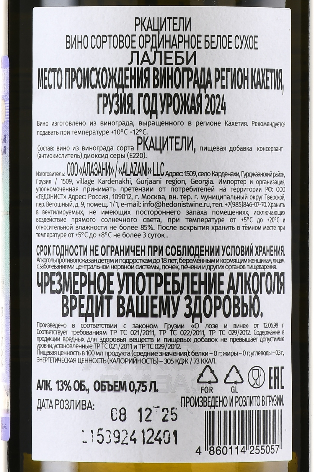 Вино Лалеби Ркацители 0.75 л белое сухое