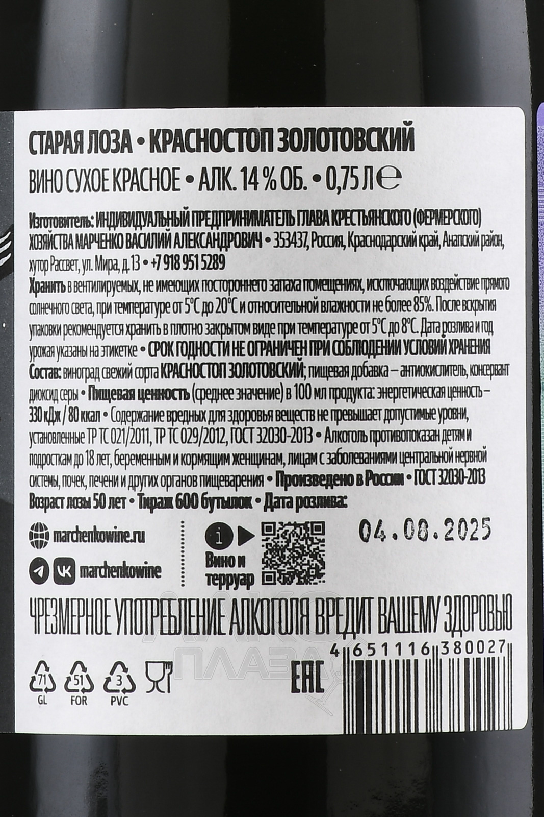 Вино Марченко Старая Лоза Красностоп Золотовский 0.75 л красное сухое
