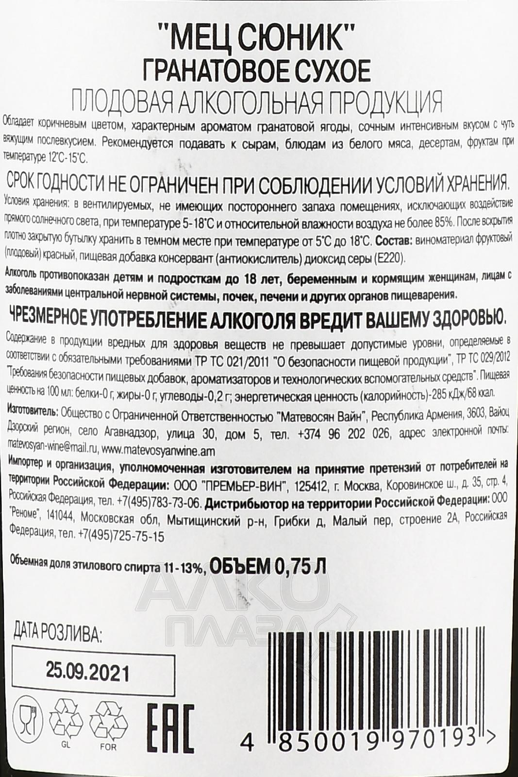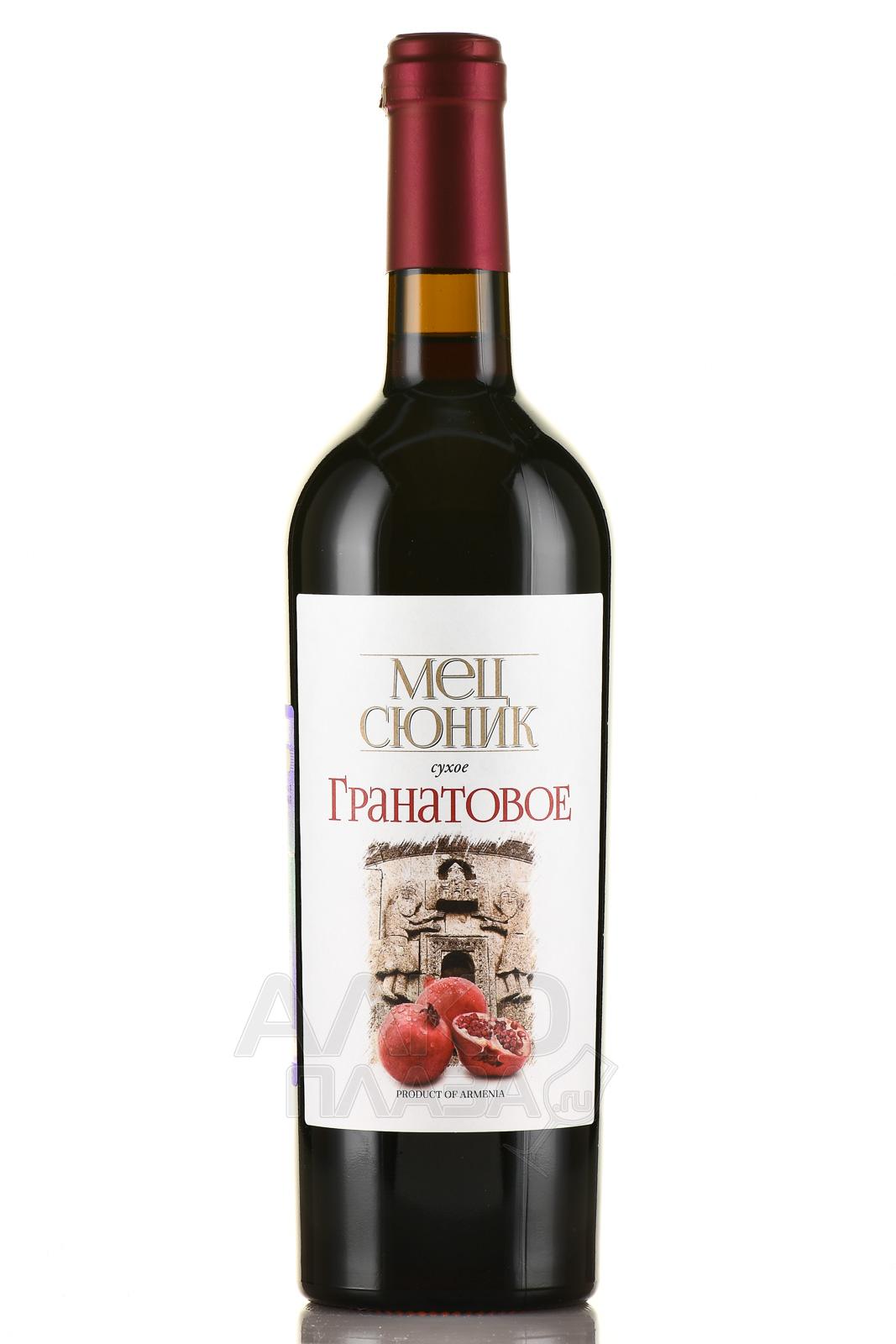 Сухое вино Мец Сюник Гранатовое 0,75 л вариации на основе плодового сырья. Гранаты, из которых оно изготовлено, созревают в жарких районах Сюникской области, расположенной на юге Армении. На определенном этапе гранатовый сок бродит в стальных ферментерах при контролируемой температуре, превращаясь в изысканный спиртной напиток с богатой органолептикой. Это один из представлений сортов алкоголя солнечных стран Кавказа и Ближнего Востока.