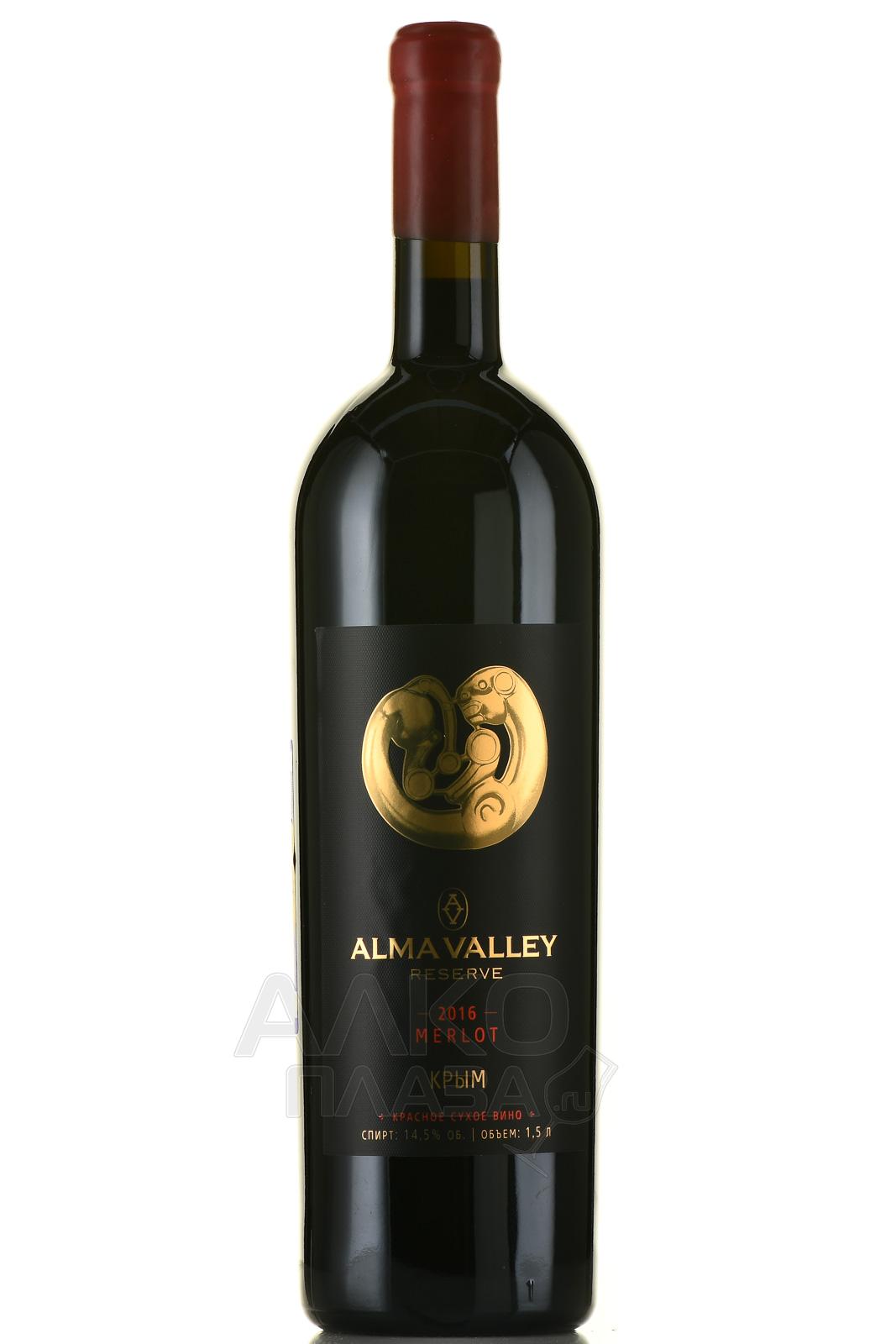 Красное сухое вино Мерло Алма Велли 1,5 л — отечественный алкоголь защищенного географического указания (он контролируется по месту происхождения — Крымскому полуострову), который состоит из стопроцентного винограда европейского сорта с участков западно-предгорной зоны Бахчисарайского района. Обработка урожая гарантированного качества прошла на заводе популярного российского производителя с применением терморегулиируемого сбраживания в металлических баках и вызревания сроком один год в дубовой таре. Вино, поставляемое в полуторалитровой бутылке для сопровождения крупного застолья, приятно употреблять молодым и на протяжении пяти лет с момента бутилирования.