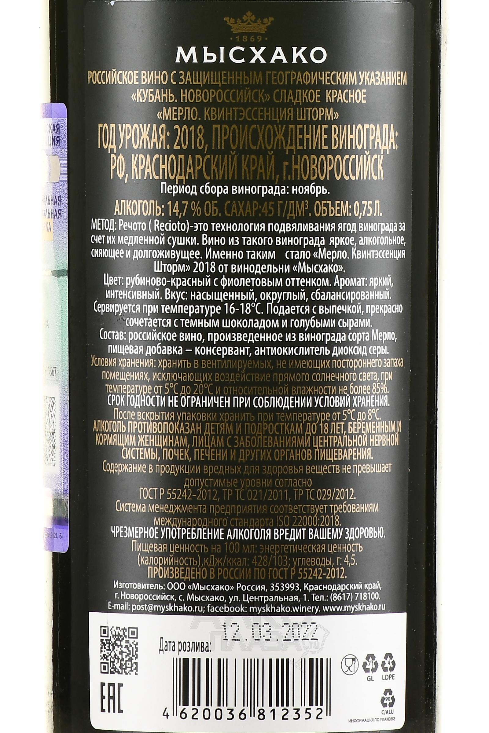 Вино Мерло Квинтэссенция Шторм Мысхако 0.75 л красное сладкое
