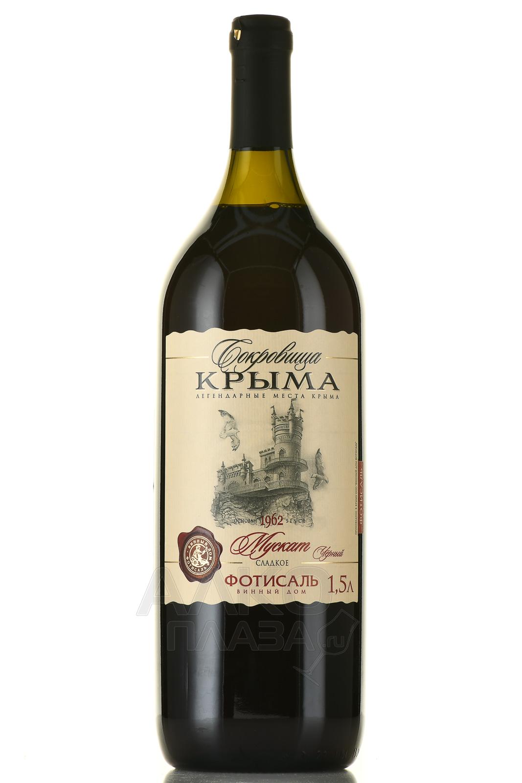 Красное сладкое вино Мускат Черный Сокровища Крыма 1.5 л — купажированный напиток из Республики Крым, который изготовлен из купажа красных сортов ягод, которые были выращены в теплом климате Бахчисарайского района и собраны в один год. Уровень сахара составляет 55-65 г/дм. Это десертное вино в 1.5-литровой бутылке рекомендуется подавать охлажденным.