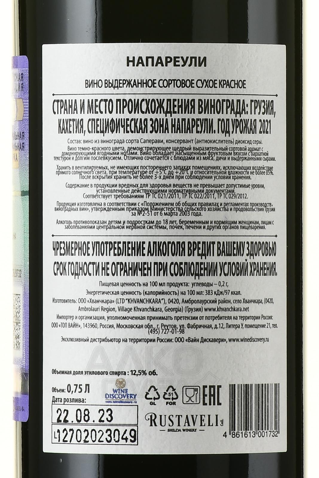 Красное сухое вино Напареули Руставели 2021 года 0,75 л обладает одной яркой особенностью: для него используется исконный грузинский сорт Саперави, культивируемый на ограниченной площади в микрозоне Напареули. Уникальное сочетание природных и климатических факторов формируют особую органолептику винограда, что отражается в стилистике напитка. Винификация протекает в рамках традиционной методики. Вино проходит длительную выдержку в дубе и стали.