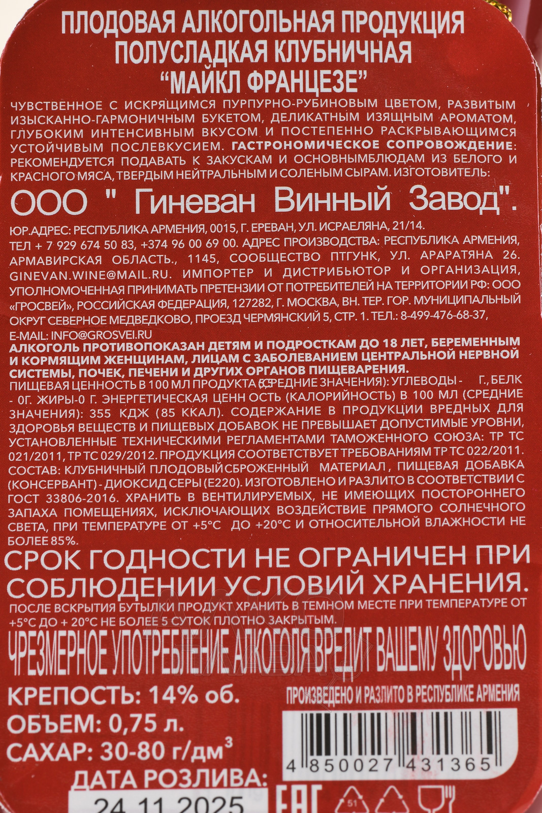 Вино плодовое Майкл Францезе Клубника 0.75 л полусладкое в п/у