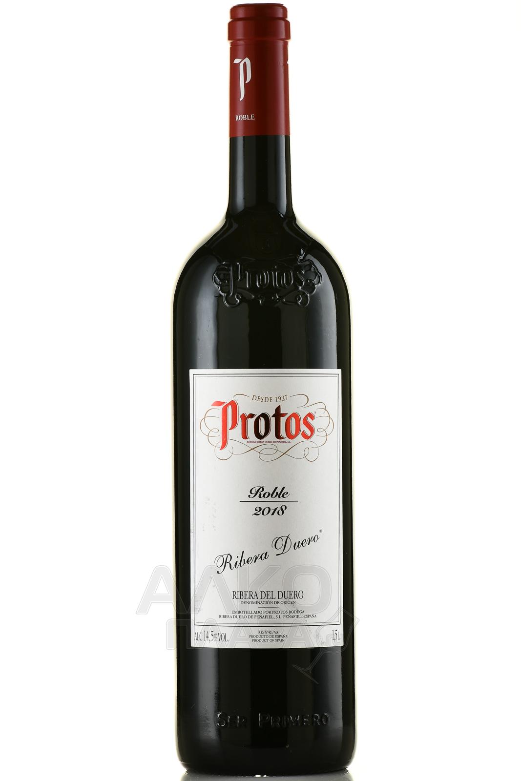 Protos Roble вино винодельческого хозяйства Bodegas Protos, производится из 100% сорта Темпранильо. Винификация делается в стальных емкостях при постоянной, контролируемой температуре 24 °С на протяжение 15 дней. Выдерживается вино в бочках, часть которых изготовлены из американского, а другая половина из французского дуба, на протяжение 6 месяцев и столько же в бутылках.