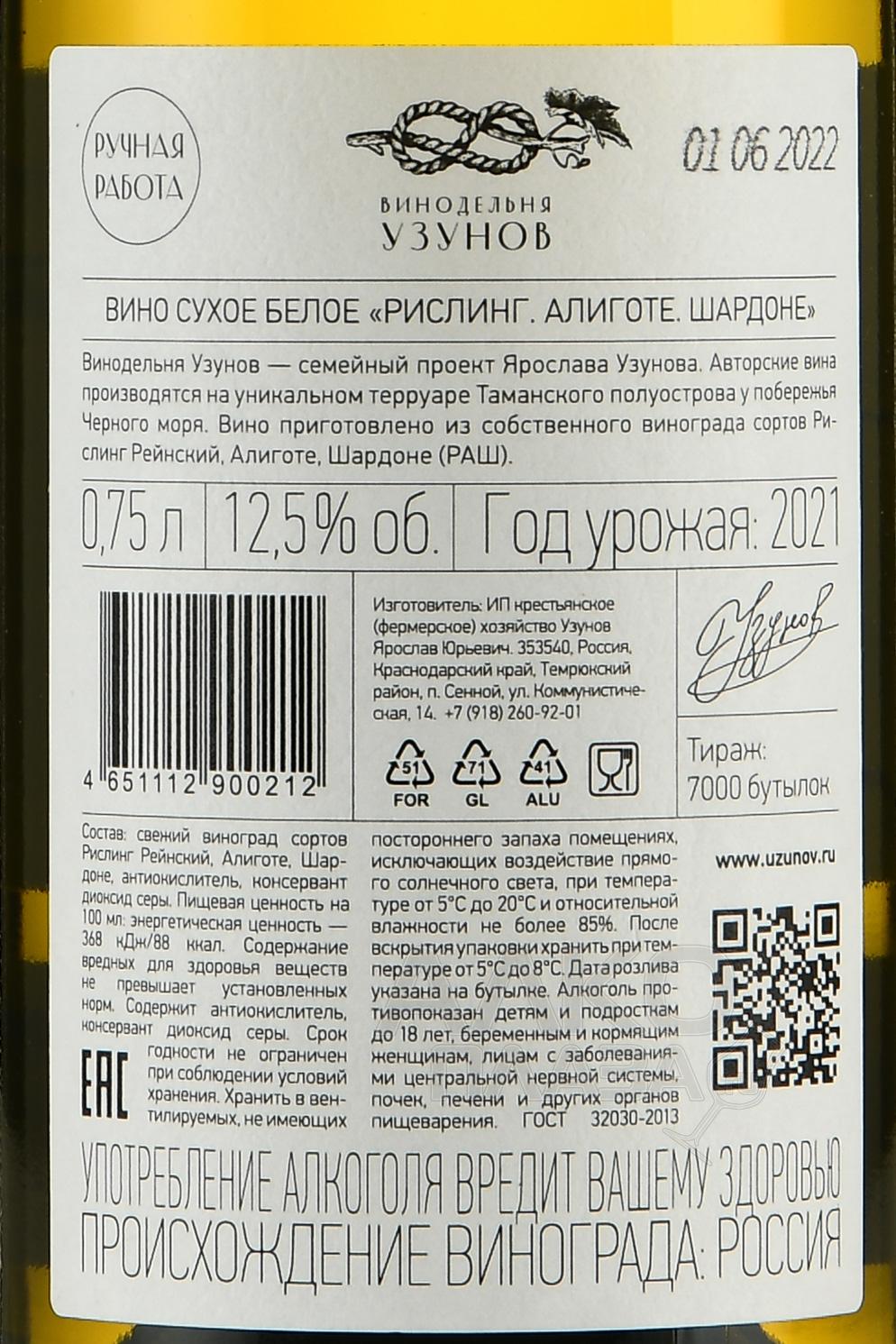 Белое сухое вино Вино Рислинг Алиготе Шардоне 2021 г. 0,75 л — авторский напиток, выпущенный в рамках семейного проекта под руководством винодела Ярослава Узунова. Основой вариации послужили три виноградные вариации из самобытного терруара Таманского полуострова, выращенные на черноморском побережье и собранные в пределах определенного урожайного сезона. Производство осуществилось с применением ручного труда по методам отжима, ферментации и вызревания на дрожжевом осадке. Крепость вина составляет 12.5%.