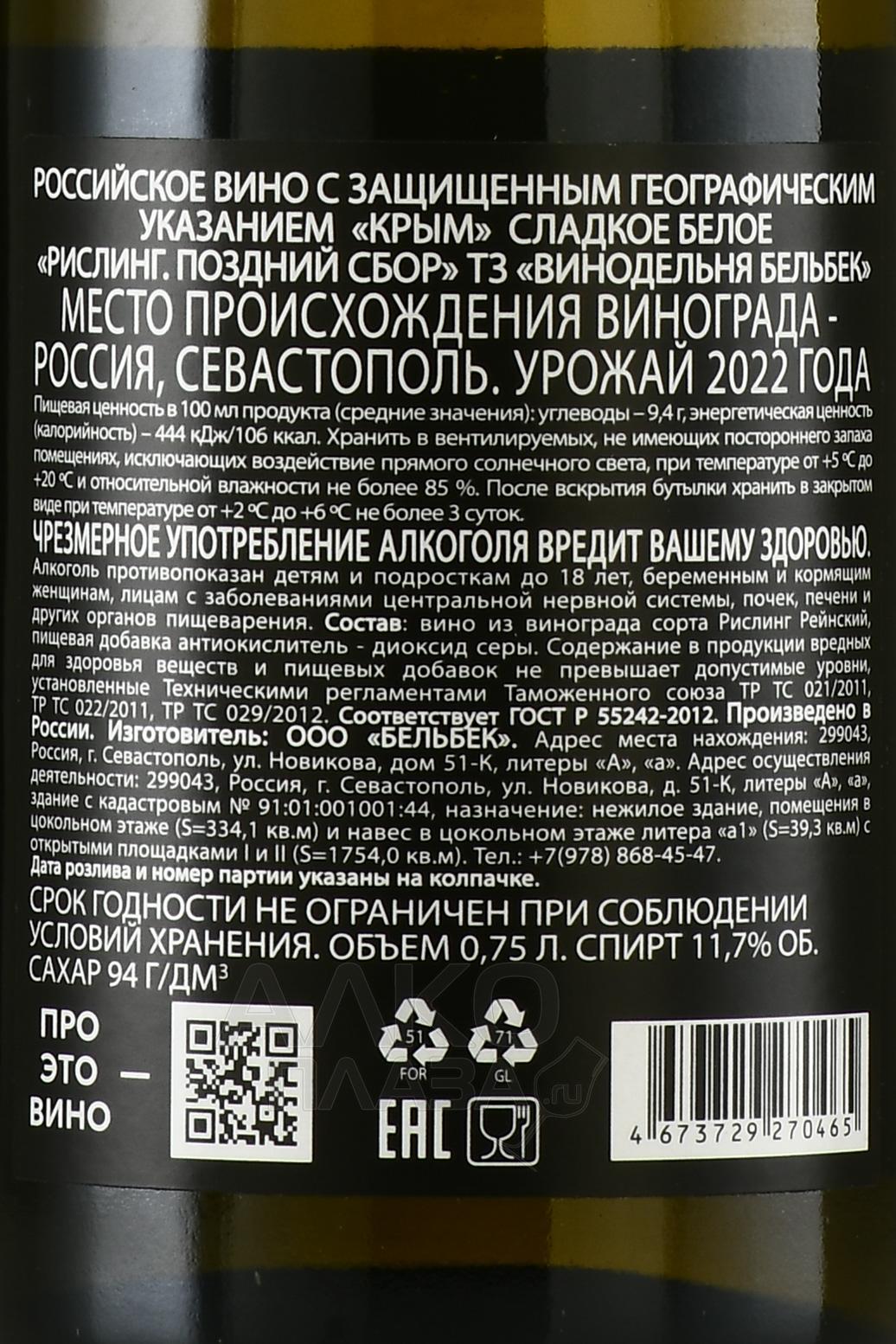 Вино белое сладкое Бельбек Рислинг Поздний сбор 2022 г. 0,75 л – первый опыт переработки урожаев late harvest от самобытного крымского предприятия. Ягоды, созревшие на осадочных, с высоким содержанием щебня и глины почвах плато Кара-Тау на севере Севастополя, вручную собрали в конце осени после первых заморозков. В погребе сок аккуратно отделили от мезги с помощью мембранного пресса и частично ферментировали, остановив брожение в нужный момент путем охлаждения сусла. 4 месяца напиток созревал на тонком осадке при низкой температуре.