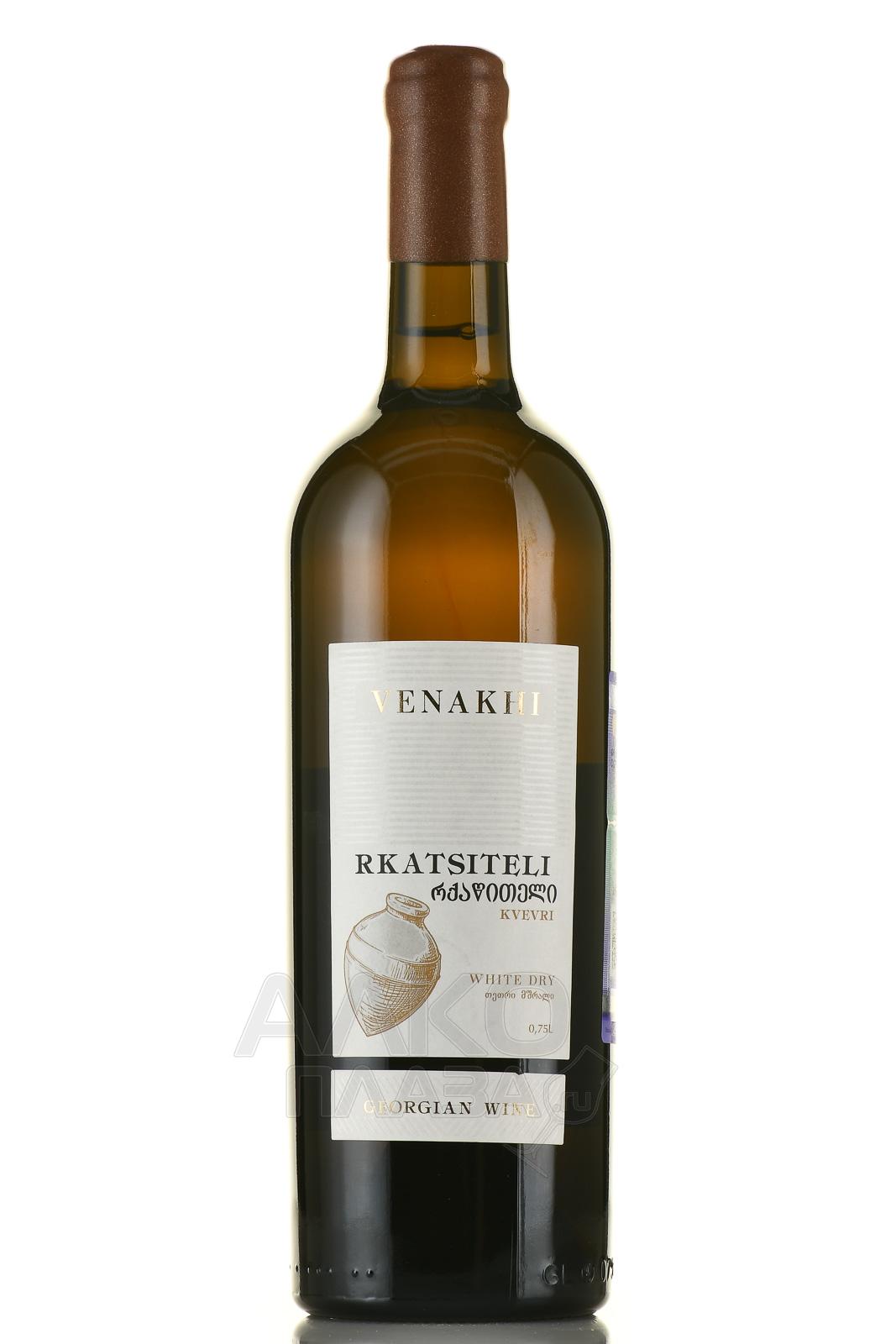 Белое сухое вино Rkatsiteli Kvevri Venakhi 0,75 л изготовлено по традиционной кахетинской технологии. На винификацию пошли ягоды автохтонного грузинского винограда со светлой кожицей. Плоды вместе с веточками поместили в специальные глиняные чаны квеври большого размера. Емкости находятся под землей до самой горловины, что обеспечивает естественную постоянную температуру брожения. После окончания ферментации спиртное оставили отдыхать не менее чем на 8 месяцев.