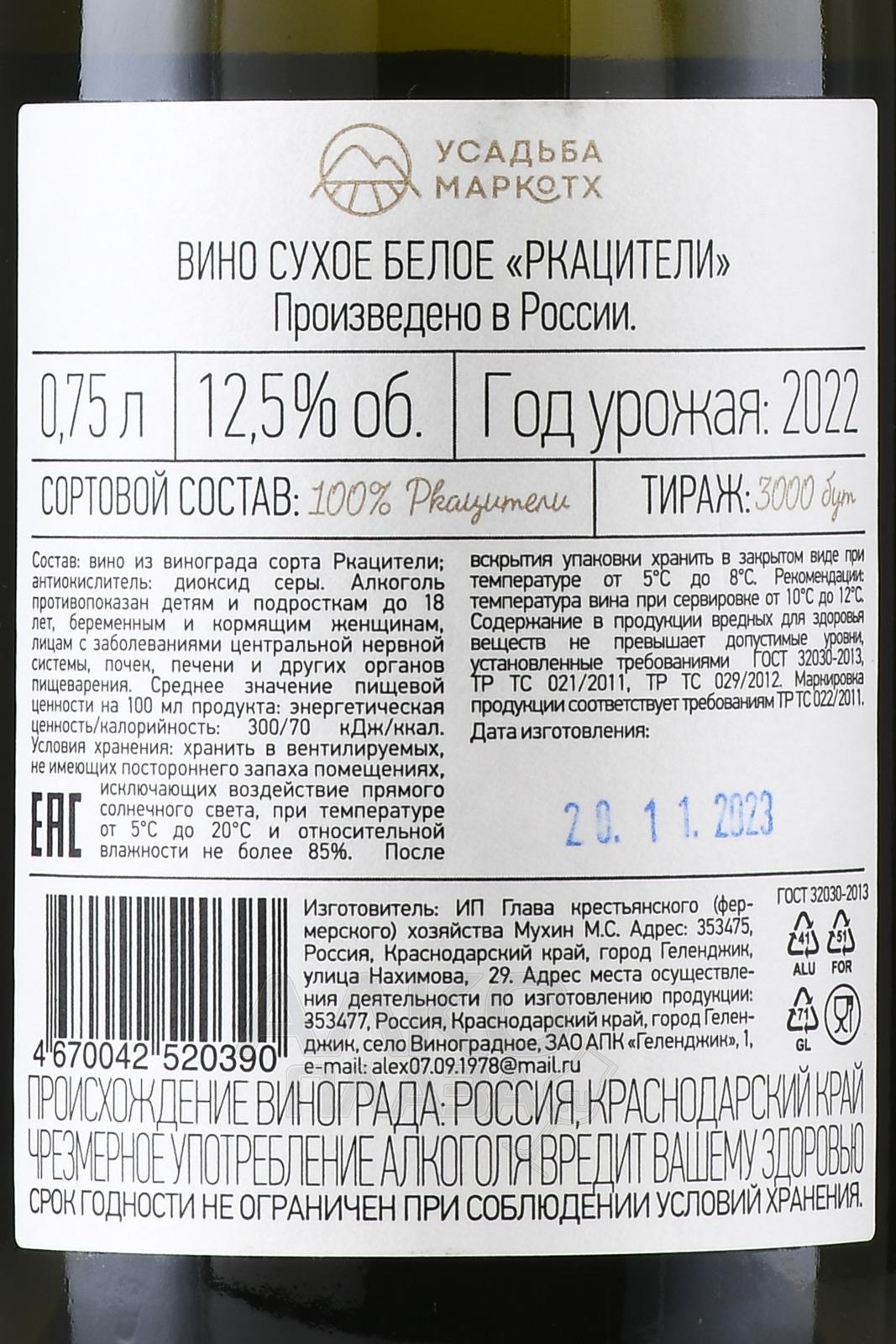 Белое сухое вино Вино Ркацители Усадьба Маркотх 2022 год 0,75 л состоит из винограда, обозначенного в названии: популярного сорта Ркацители, собранного на территории РФ, в Краснодарском крае. Урожай с участков, находящихся в селе Кабардинка и обладающих низкой урожайностью, прошел ферментацию в чанах где поддерживался температурный режим от 17 до 18 градусов Цельсия. Часть сусла сбраживалась в новых бочках из кавказского дуба. Выдержка на тонком осадке, которая сопровождалась регулярным перемешиванием вина, заняла десять месяцев. Эта разновидность поступила в продажу лимитированным тиражом из 3000 бутылок.