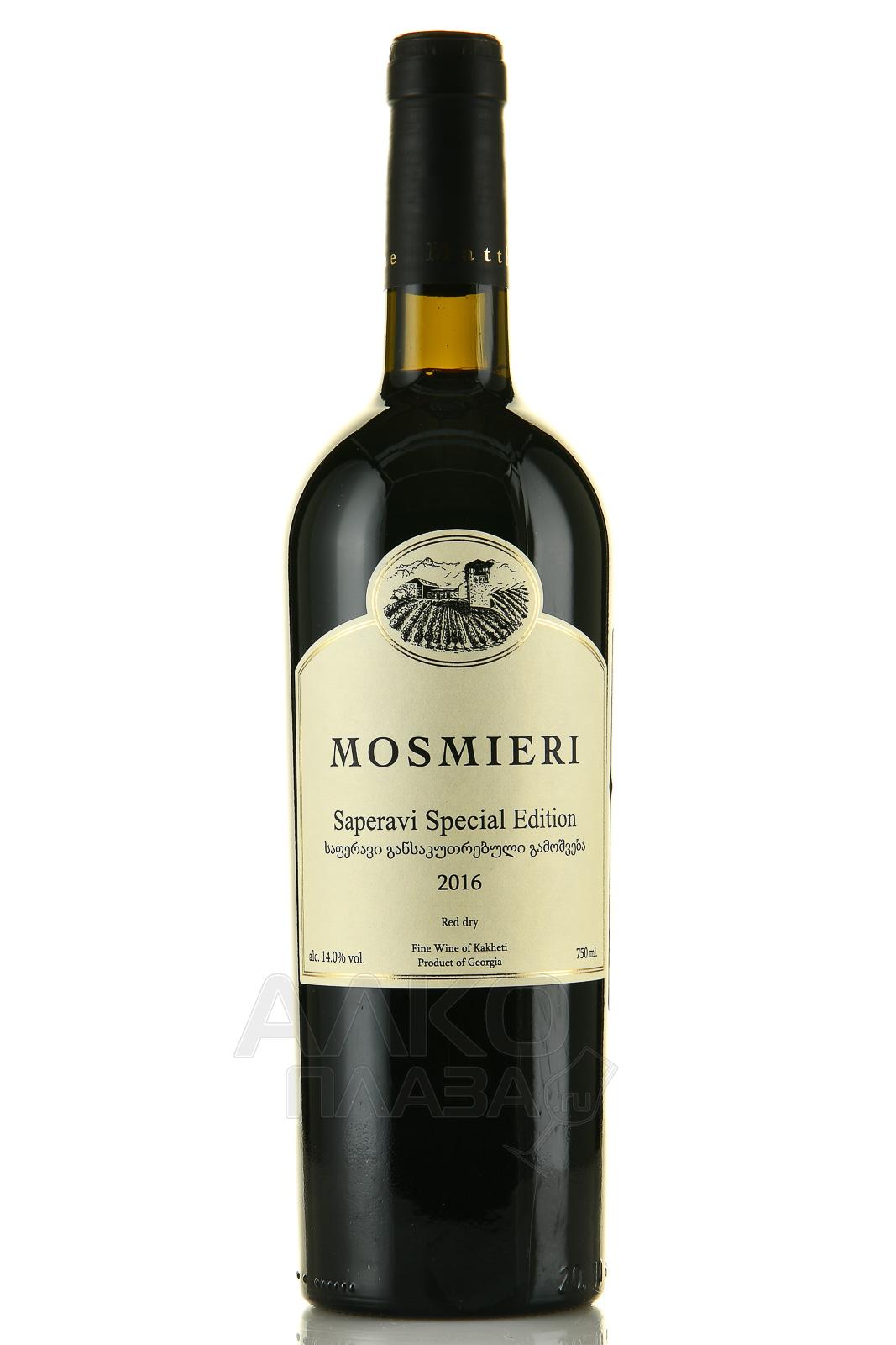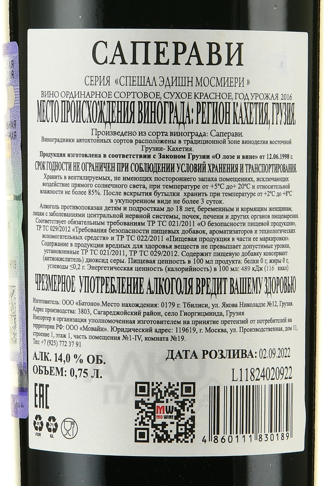 Вино красное сухое Saperavi Special Edition Mosmieri 0,75 л изготовлено из ведущего грузинского сорта винограда. Урожаи для создания напитка собрали вручную в традиционной винодельческой зоне Кахетия на востоке страны. В погребе плоды подвергли дроблению и сбраживанию, после чего спиртное на протяжении 10 месяцев созревало в бочках из французского дуба. Для полного раскрытия букета вино перед употреблением рекомендуется декантировать как минимум один час.