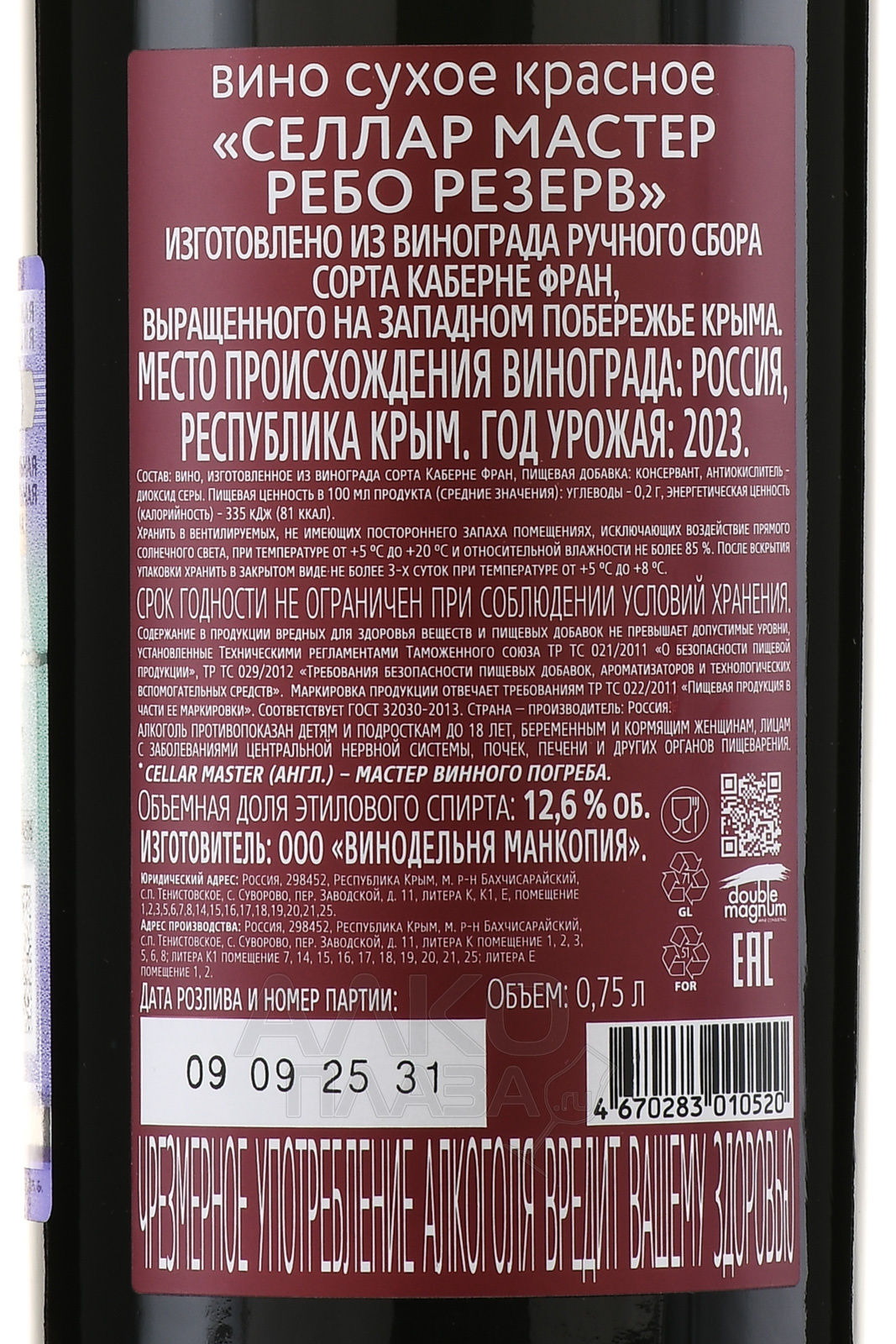 Вино Селлар Мастер Ребо Резерв 0.75 л красное сухое