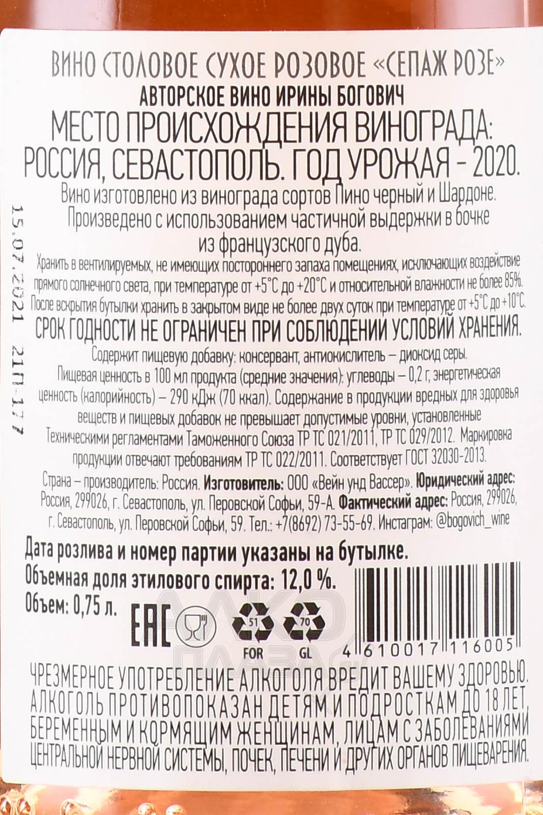 Авторское розовое сухое вино Ирины Богович Сепаж Розе 0.75 л изготавливается из крымского винограда по уникальной технологии. Для этого крафтового винтажа были тщательно отобраны красный и белый сорта. Их ферментировали совместно в стальных чанах, за счет чего напиток приобрел нежный оттенок. Это вино не предназначено для длительной выдержки, и все свои достоинства раскрывает в молодом возрасте. В бутылках оно хранится 1-2 года после розлива.