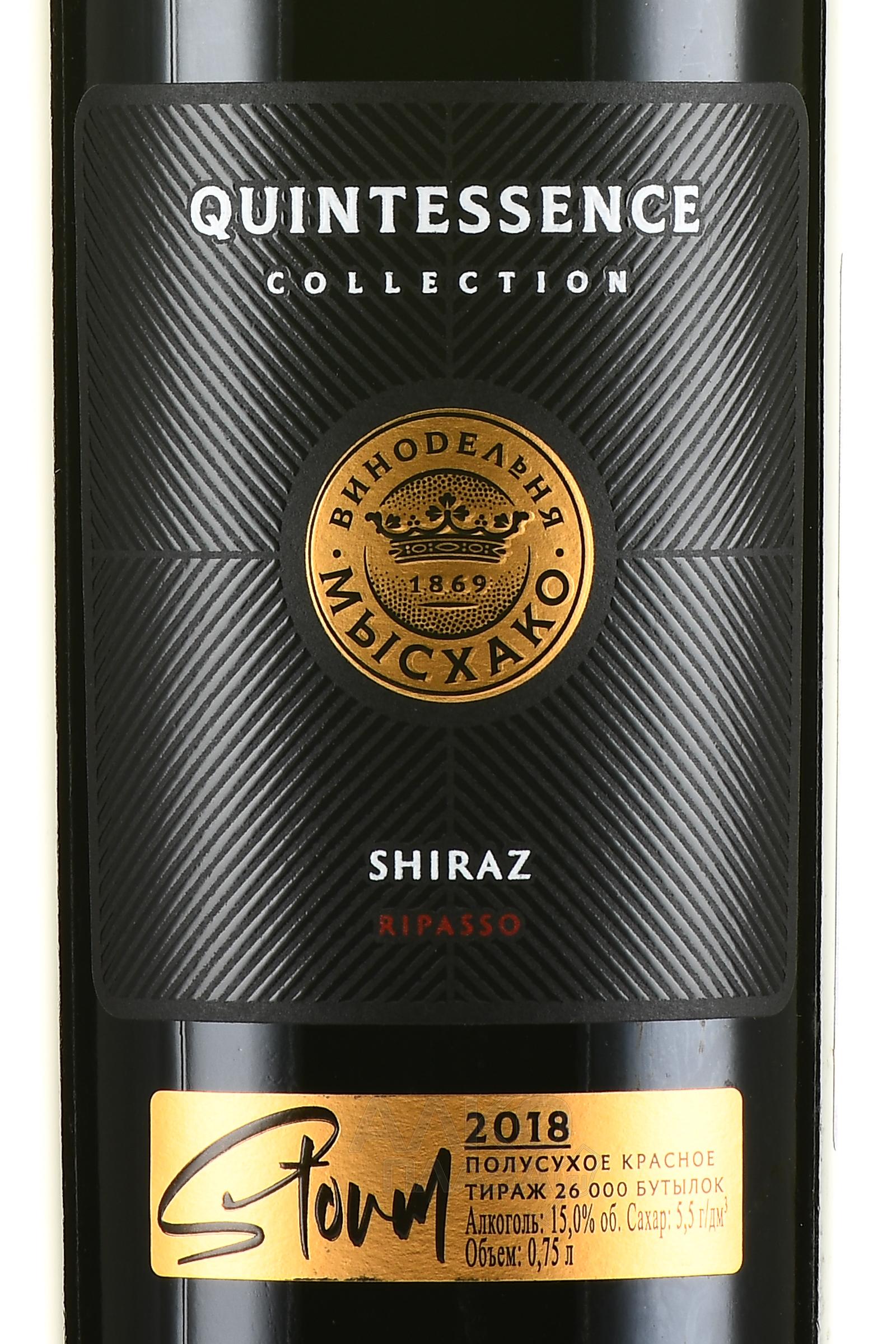 Красное полусухое вино Шираз Квинтэссенция Шторм Мысхако 2018 г. 0,75 л создано с использованием итальянской технологии «рипассо». В состав винтажа вошли плоды, собранные на побережье Черного моря в окрестностях Новороссийска. Предварительно их подсушили для получения более концентрированной ароматики и сладости. Затем заизюмленный виноград добавили в уже сброженное молодое вино из свежих ягод и провели повторную ферментацию.