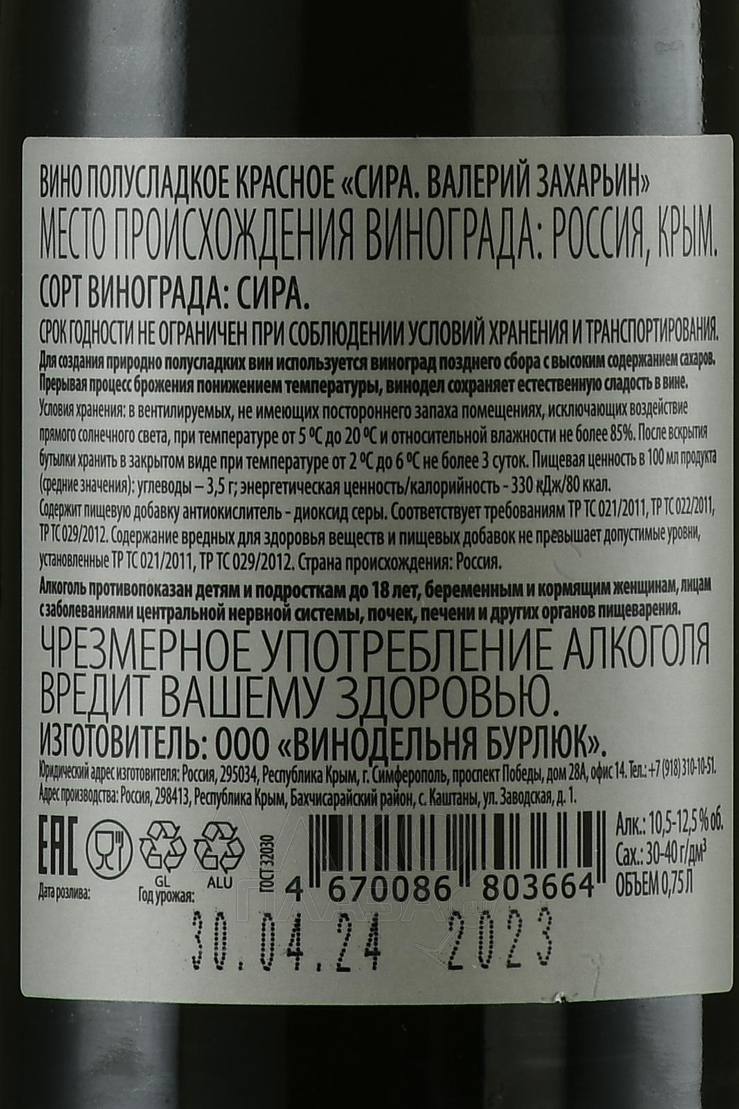 Вино красное полусладкое Сира Валерий Захарьин 0,75 л – необычное выражение популярного французского сорта с насыщенной органолептикой. Спиртное получено из ягод позднего сбора, созревших на крымских виноградниках, в терруаре категории ЗГУ. Природную сладость сырья в готовом напитке удалось сохранить благодаря неполной ферментации – процесс брожения остановили путем охлаждения сусла по достижении требуемых значений сахаристости.