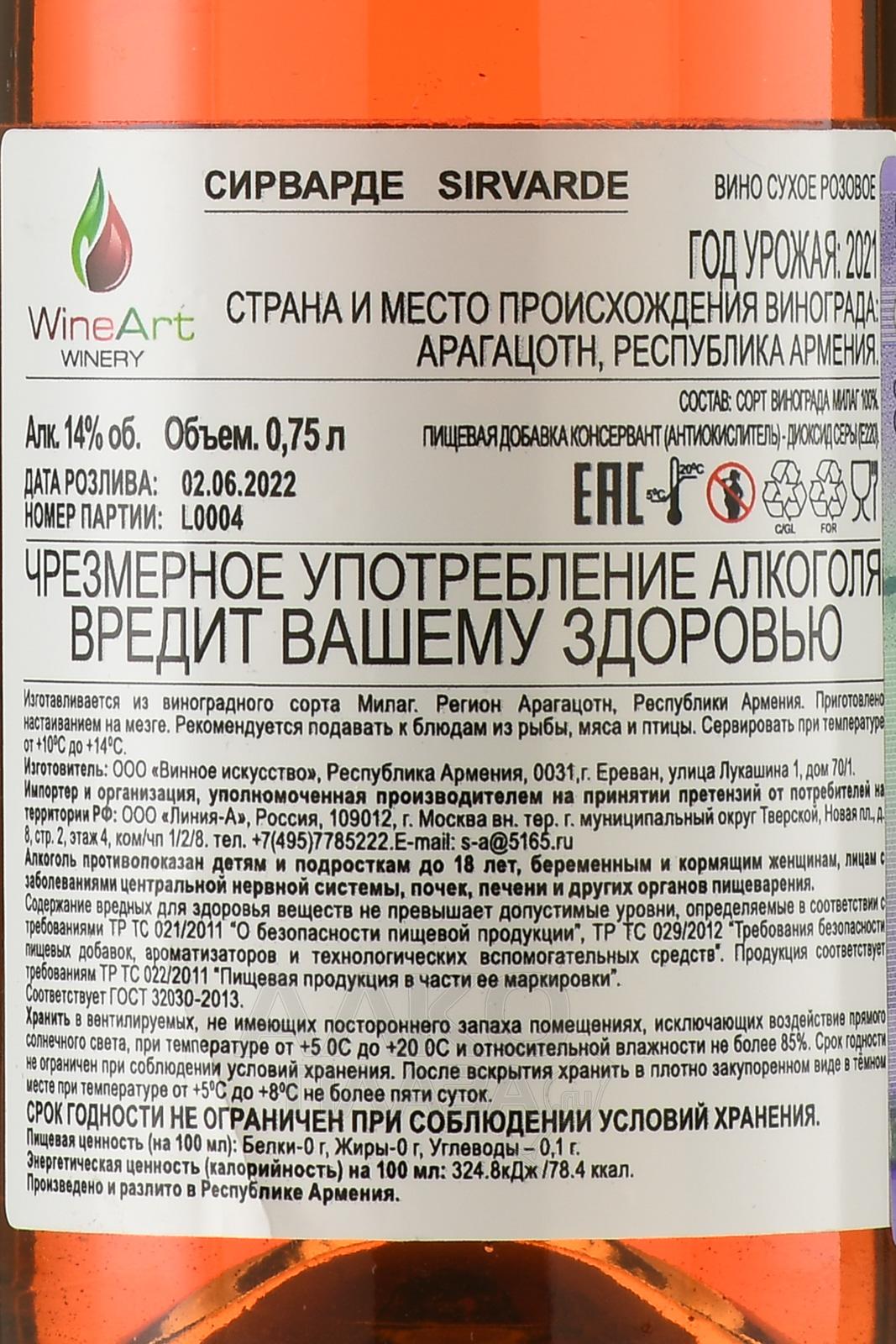Розовое сухое вино Сирварде 2021 г. 0,75 л — 14-градусный алкогольный напиток средней ценовой категории, местностью изготовления которого стала Арагацотнская область Армении.В его составе представлен виноград аборигенной группы, относящийся к вариациям позднего периода созревания. Спелый урожай собрали вручную на протяжении одинакового сезона и отсортировали, после чего сырье непродолжительное время мацерировалось на кожице. Процедура сбраживания осуществилась со строгим температурным контролем в нейтральных чанах на металлической основе.
