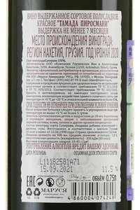 Красное полусладкое вино Тамада Пиросмани 2020 г. 0,75 л с сахаристостью не выше 45 г/л и содержанием алкоголя 11,5% изготовили в регионе Грузии Кахетии из традиционного винограда Алазанской долины. Сбор прошел на плантациях с суглинистым и карбонатным составом почв в течение одного года. Ягоды сорвали с лоз только после полного созревания, когда они накопили достаточное количество сахара. После гребнеотделения сырье ферментировалось на мезге, а затем вино налили в дубовые бочонки для семимесячной выдержки.