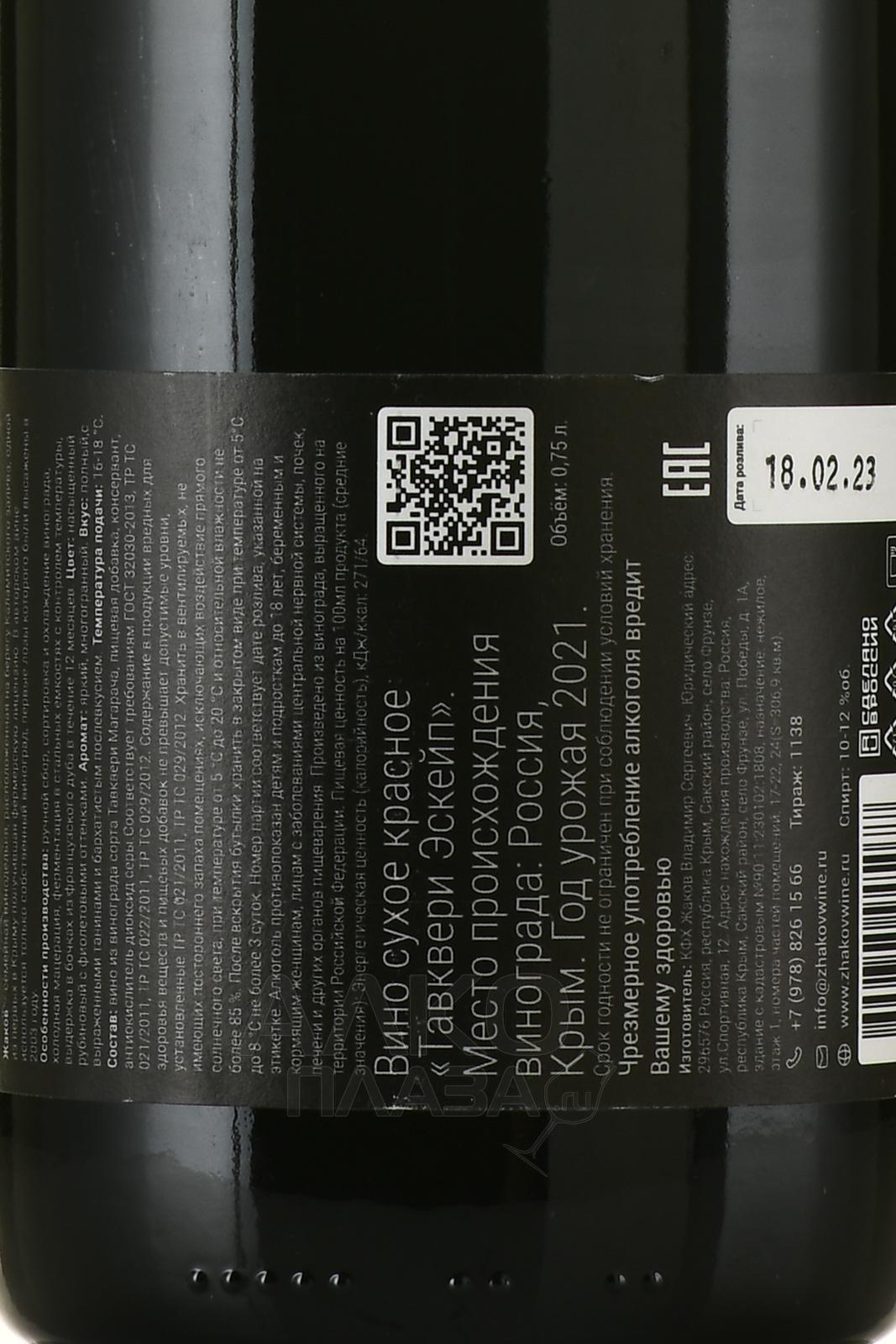 Вино красное сухое Тавквери Escape 0,75 л – моносепажная вариация от одного из развивающихся крымских хозяйств. Напиток создан из ягод гибридной лозы, полученной в результате скрещивания редкого грузинского винограда Тавквери и популярного в Крыму сорта Магарача. Собранные вручную в один сезон плоды сортировали и охладили, после чего подвергли мацерации и ферментации в стальных бродильных чанах с контролем температуры. В завершение спиртное созревало на протяжении 12 месяцев в бочках из французского дуба. Образцы из линейки Эскейп отличаются хорошим потенциалом к старению в бутылке и насыщенным сложным вкусом, который лучше всего раскрывается после декантации.