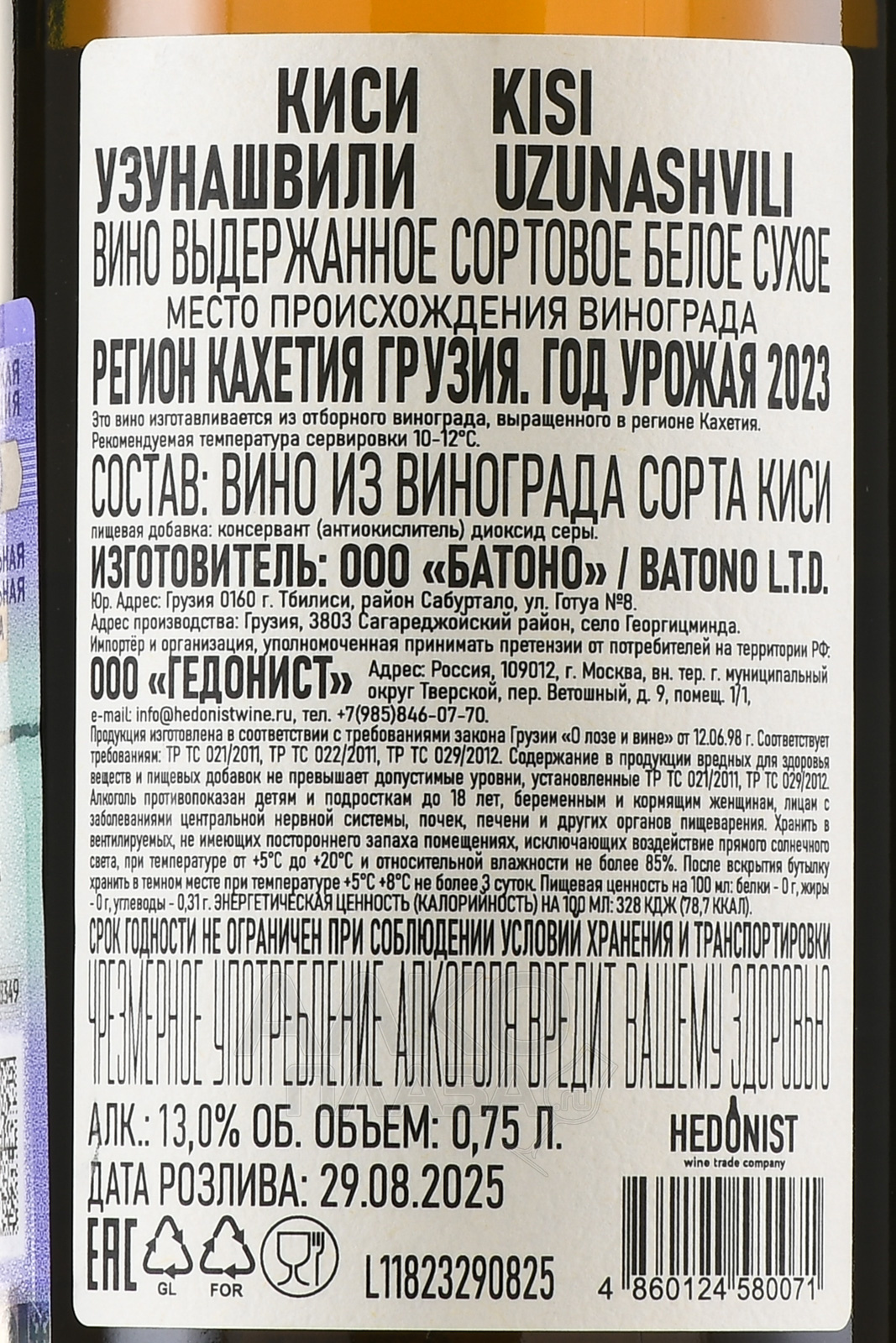 Вино Узунашвили Киси Квеври 0.75 л белое сухое
