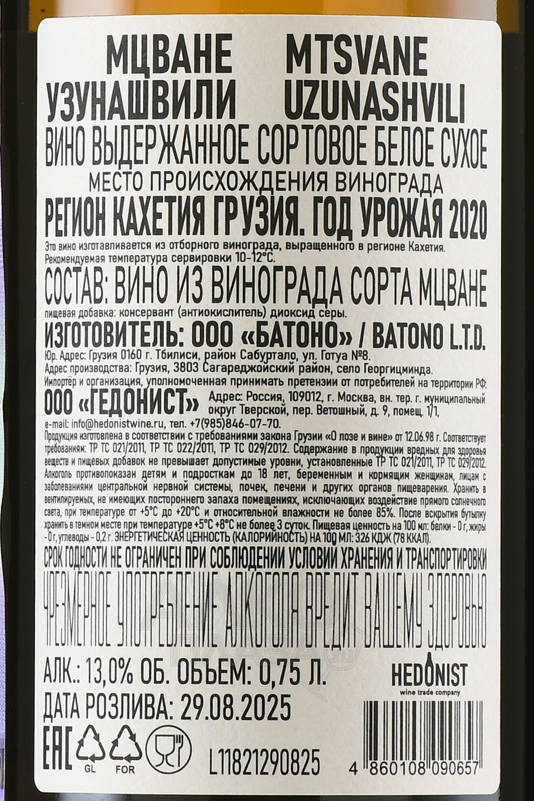Вино Узунашвили Мцване Квеври 0.75 л белое сухое