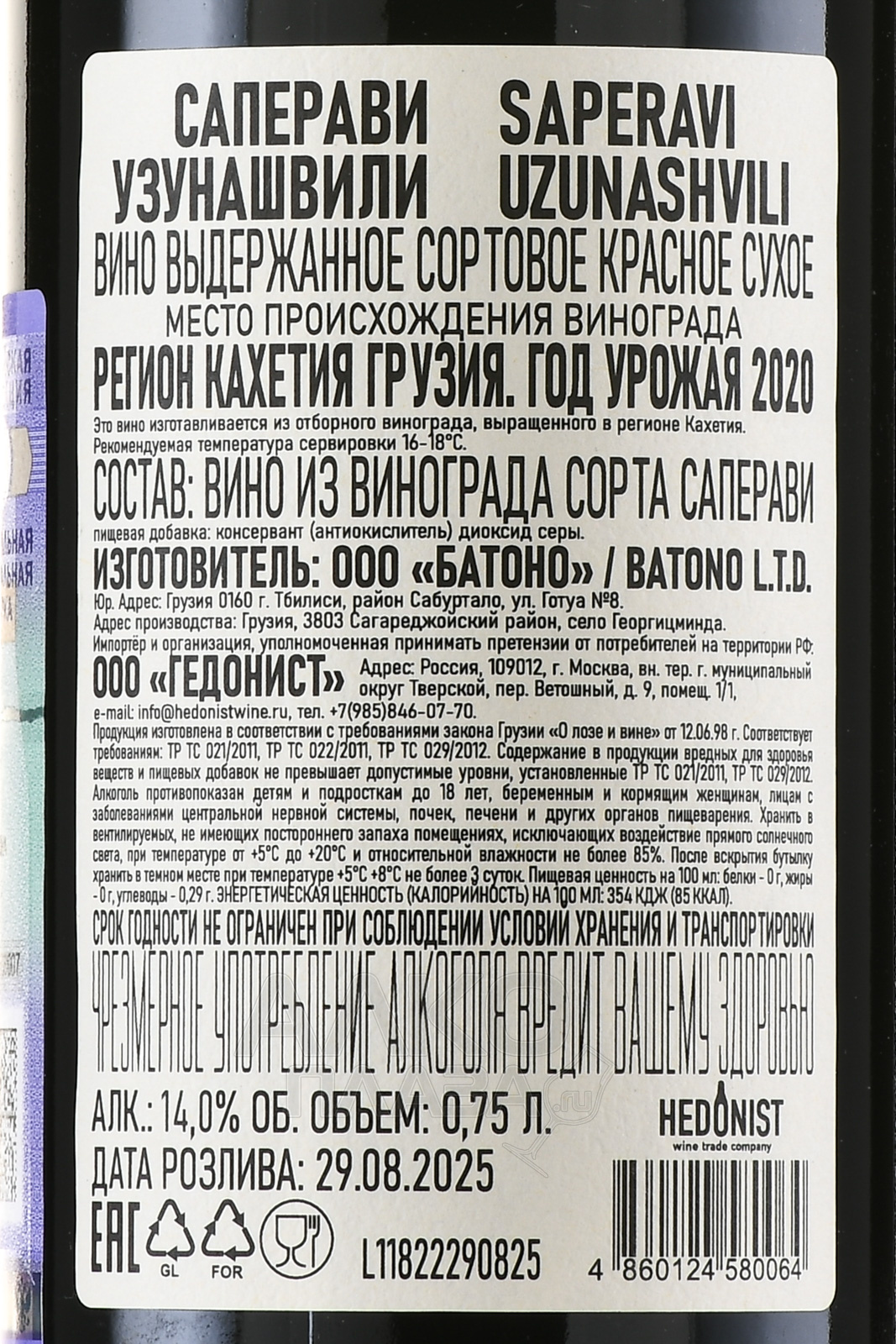 Вино Узунашвили Саперави Квеври 0.75 л красное сухое