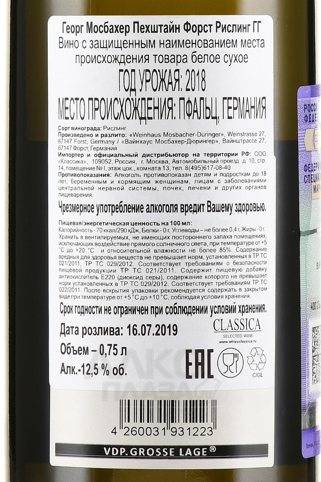 Белое сухое вино Georg Mosbacher Pechstein Forst GG Riesling Trocken 0,75 л – вариация с виноградника высшего класса. Участок Пехштайн получил свое название от базальтовых пород, во множестве содержащихся в местных почвах. Лозы здесь высажены на площади 0,15 га на юго-восточном склоне, поднимающемся к опушке леса. Легкий вулканический грунт нагревается на солнце, а затем отдает аккумулированное тепло растениям, обеспечивая равномерное созревание ягод. Сбор проходил вручную, с тщательной сортировкой сразу на месте. В погребе плоды еще раз перебрали и прессовали. Отжатый сок ферментировали спонтанно в деревянных бочках разного объема, что позволило получить напиток с богатой вкусоароматической композицией.