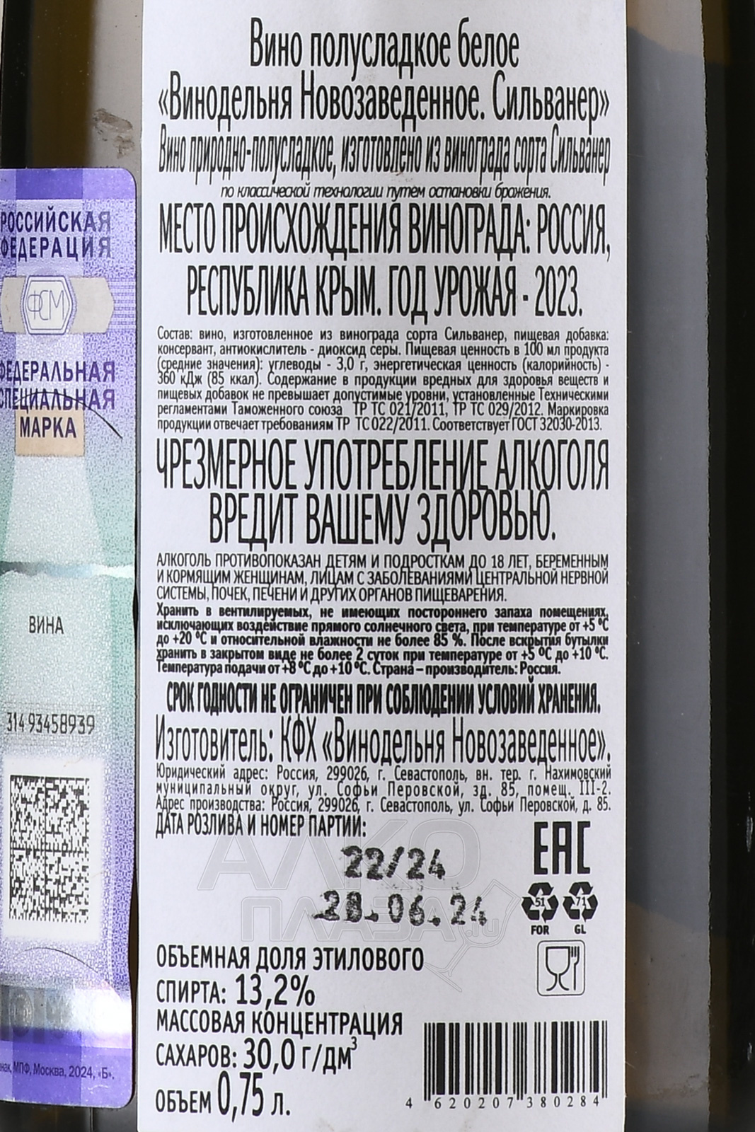 Вино Винодельня Новозаведенное Сильванер 0.75 л белое полусладкое