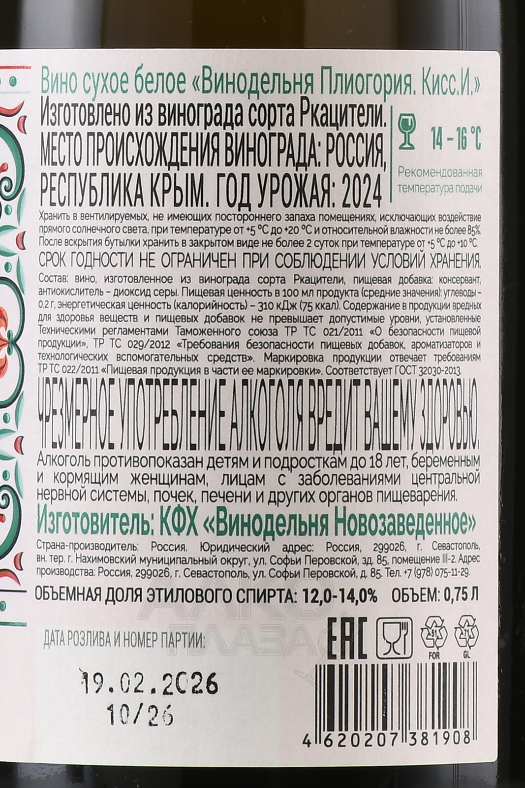 Вино Винодельня Плиогория Кисс.И. 0.75 л белое сухое
