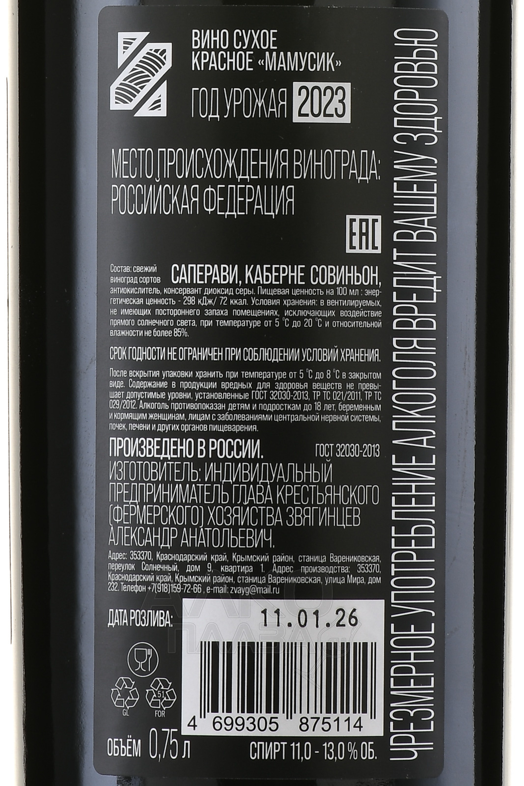 Вино Звягинцев Мамусик Каберне Саперави 0.75 л красное сухое