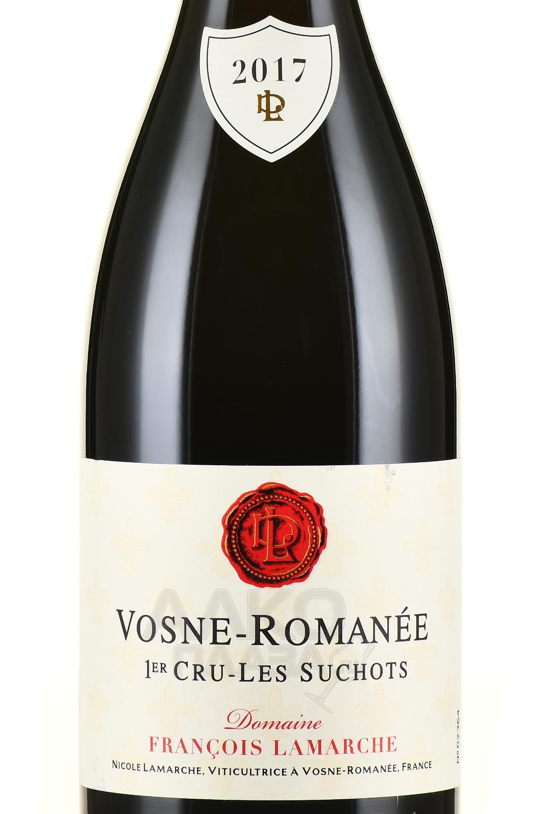 Красное сухое вино Vosne-Romanee 1-er Cru Domaine Francois Lamarche Les Suchots 2017 г. 0,75 л — винтаж из урожая удачного года, получивший отличные отзывы от критиков. Для производства использовался один сорт, выращенный на винограднике Ле Шом в Бургундии, который имеет статус Премьер Крю. Сырье собирали вручную в течение недели — 7-14 сентября. После гребнеотделения ягоды прессовали, а сусло ферментировали в стальных чанах при постоянной температуре. Вино выдерживалось в дубовых бочках 20 месяцев и разливалось в бутылки без фильтрации.