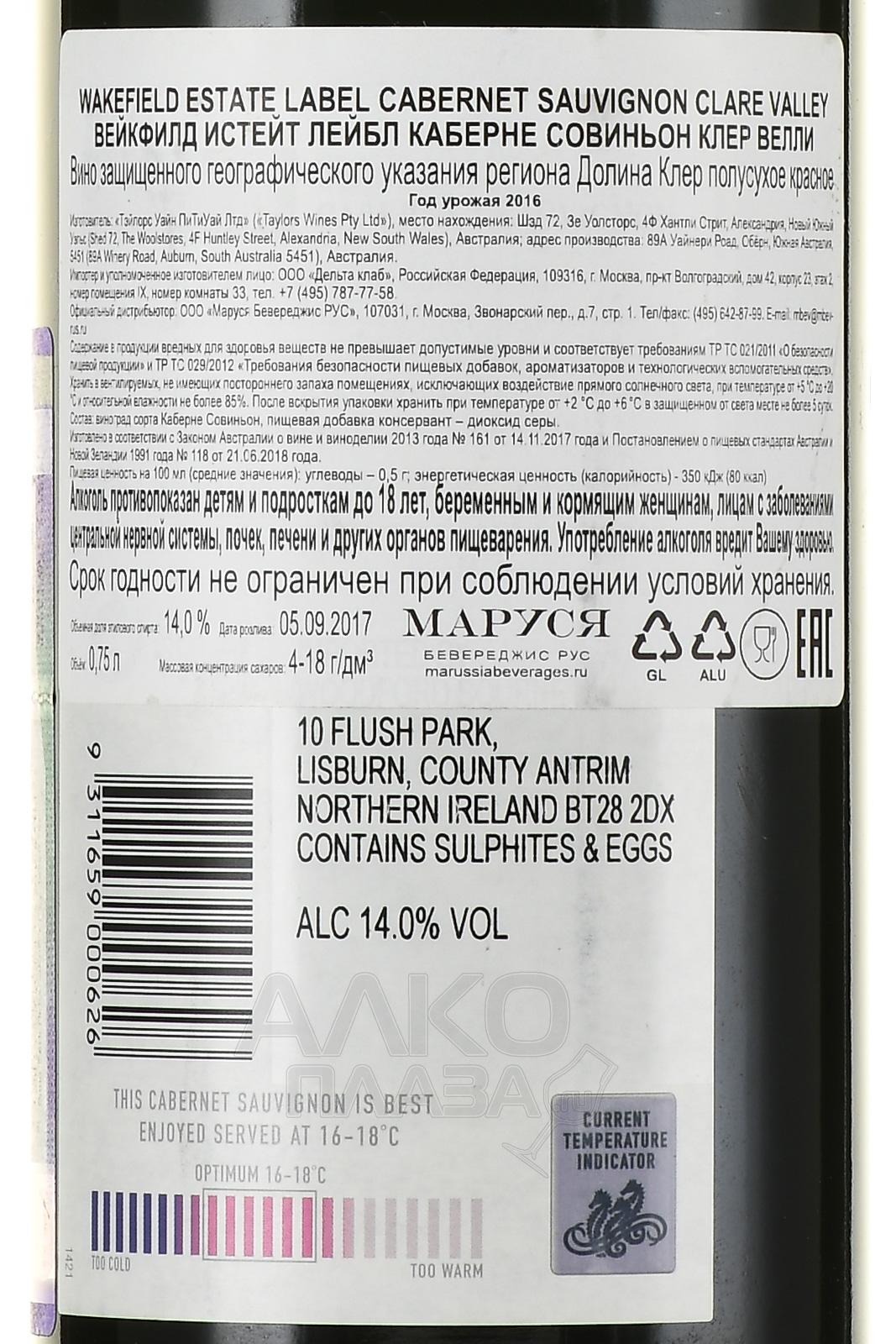 Красное полусухое вино Wakefield Estate Label Cabernet Sauvignon 2016 г. 0,75 л — 14-градусный австралийский качественный алкоголь небольшой сладости (до 18 г/дм³), который произвели из свежего урожая южной части Зеленого континента. Утренний сбор завершился внимательной сортировкой, после ее проведения ягоды доставили на винодельню для сбраживания в дубовых и стальных резервуарах. Вино разлили по бутылкам по завершении выдержки в отборных бочках из французской древесины дуба.