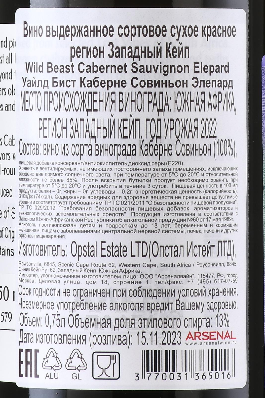 Красное сухое вино Wild Beast Cabernet Sauvignon Elepard 0,75 л создали в Южной Африке, в регионе Западный Кейп. Терруар расположен на высоте около 250 метров над уровнем моря. Почва здесь состоит из красных глинистых и гранитных пород с хорошим дренажом. Каберне Совиньон собрали вручную в конце марта при оптимальной зрелости. Ферментация на мезге проходила в стальных емкостях при контролируемой температуре около 25 градусов. Затем напиток выдержали в дубовых бочках на протяжении 12 месяцев, что придало ему сложность и округлость.