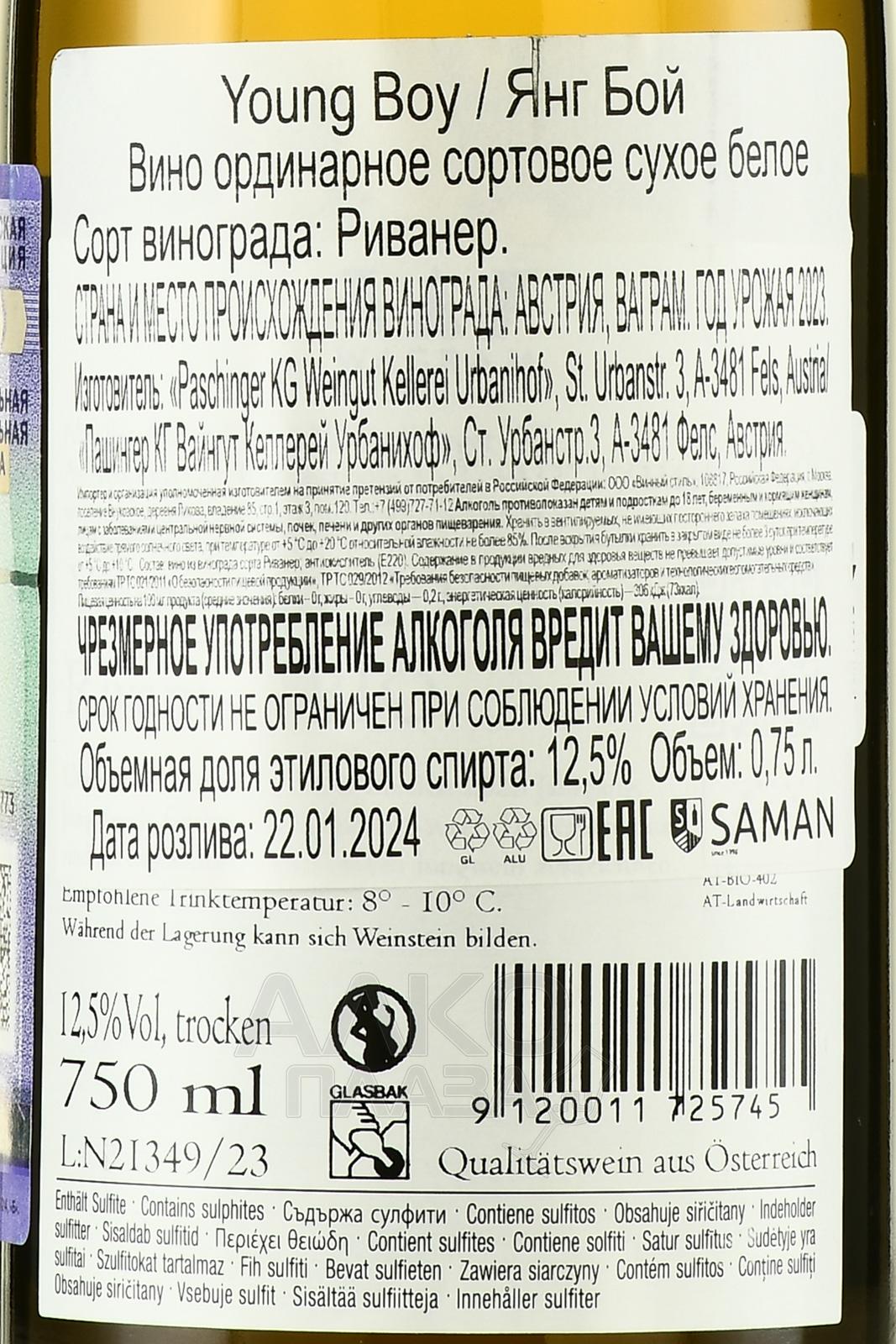 Белое сухое вино Young Boy Jungwein Urbanihof 2023 г. 0,75 л отличается выразительным терруарным стилем и озорной этикеткой. Органический моносорт происходит с виноградника Шайбе-Фельс в регионе Ваграм в Нижней Австрии. На протяжении 400 лет семейная компания возделывает здесь свои владения, уделяя огромное внимание сохранению окружающей среды. Сертифицированные в системе органического земледелия плантации покоятся на глубоких лессовых почвах, вертикальная протяженность которых достигает 30 метров. Террасы из мелкозернистого песчано-глинистого лесса отлично подходят для выращивания лоз благодаря способности хранить воду и питательные вещества. К ним добавляется благоприятный климат, сочетающий теплый паннонский ветер с востока и прохладный воздух с севера. Превосходный терруар дополняется тщательным контролем урожайности, применением биоудобрений и своевременной обрезкой кроны – все это позволяет собирать урожаи высокого качества. Вариацию изготовили путем короткой ферментации в стальных емкостях при температуре 18 °С и последующей небольшой выдержки на тонком дрожжевом осадке. Бутилирование прошло после фильтрации.